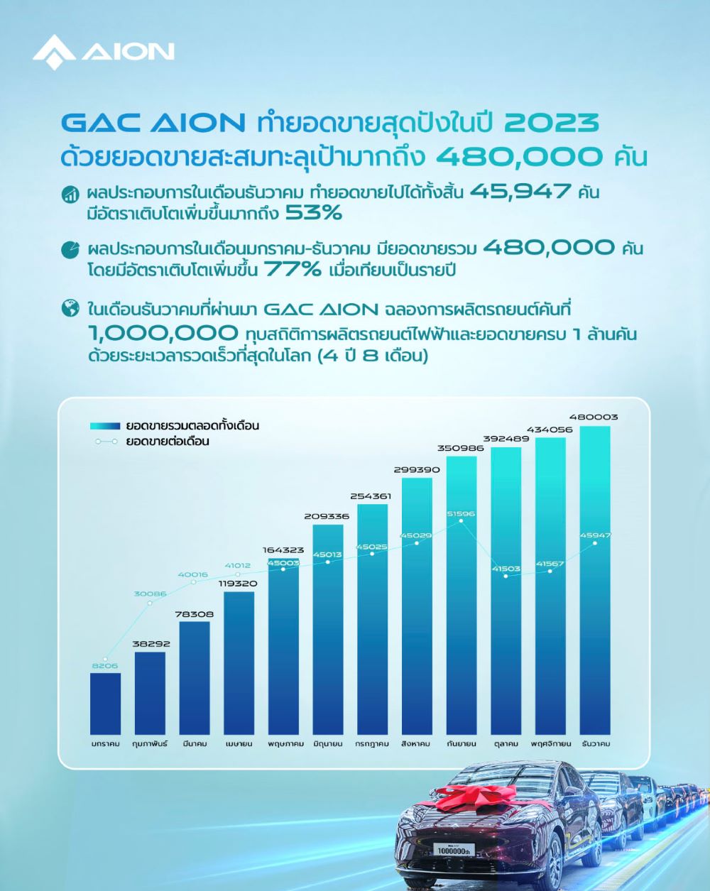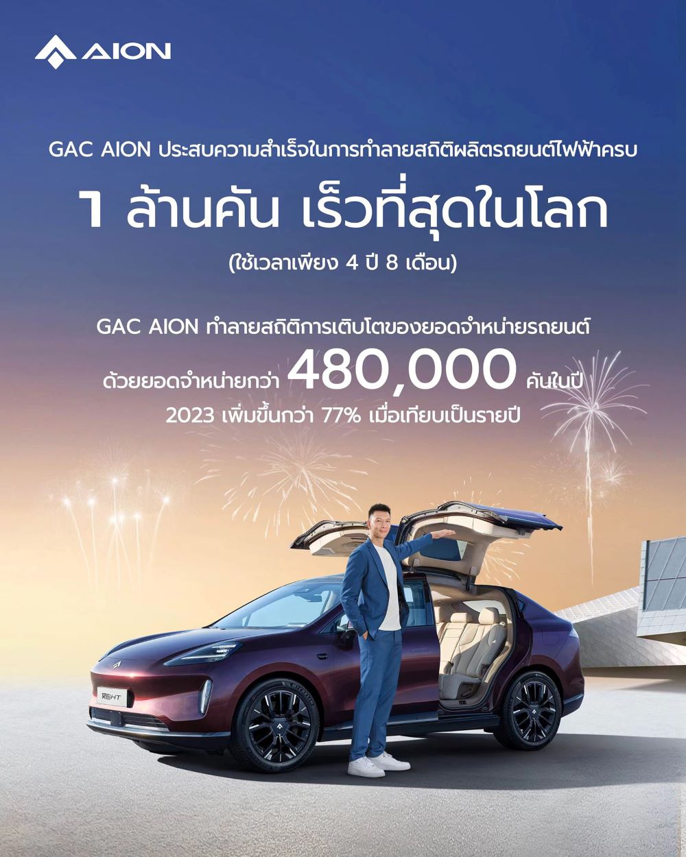 ขณะเดียวกันในตลาดโลก GAC AION มีการเติบโตอย่างรวดเร็ว ประสบความสำเร็จในการทำลายสถิติผลิตรถยนต์ไฟฟ้าครบ 1 ล้านคันเร็วที่สุดในโลก โดยใช้เวลาเพียง 4 ปี 8 เดือน และในเดือนธันวาคมได้ทำยอดขายส่งท้ายปี 2023 ด้วยจำนวน 45,947 คัน มีอัตราการเติบโตเพิ่มขึ้น 53% ขณะที่ผลประกอบในปี 2023 มียอดขายสะสมตั้งแต่เดือนมกราคม-ธันวาคม สูงถึง 480,000 คัน มีอัตราการเติบโตเพิ่มขึ้นถึง 77% เมื่อเทียบกับปี 2022