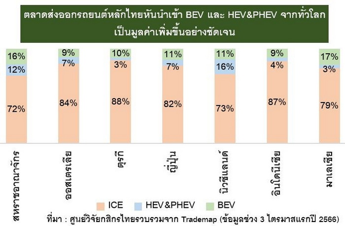 พอหันมาพิจารณาตลาดส่งออกหลักของไทย ก็พบว่าหลายตลาดนำเข้ารถยนต์ BEV และ HEV&PHEV ในสัดส่วนที่สูงขึ้นเช่นกัน โดยสูงกว่าค่าเฉลี่ยโลกซึ่งอยู่ที่ 15% ของการนำเข้ารถยนต์รวมทุกประเภท จึงเป็นโอกาสให้ไทยผลิตรถยนต์ BEV และ HEV&PHEV เพื่อส่งออกไปยังตลาดเหล่านี้ได้เพิ่มขึ้น เริ่มจากรถยนต์นั่งตามตลาดในประเทศ และพัฒนาสู่ปิกอัพต่อไปในอนาคต อาศัยจุดแข็งที่เป็นฐานผลิตปิกอัพเพื่อส่งออกระดับโลกอยู่เดิม