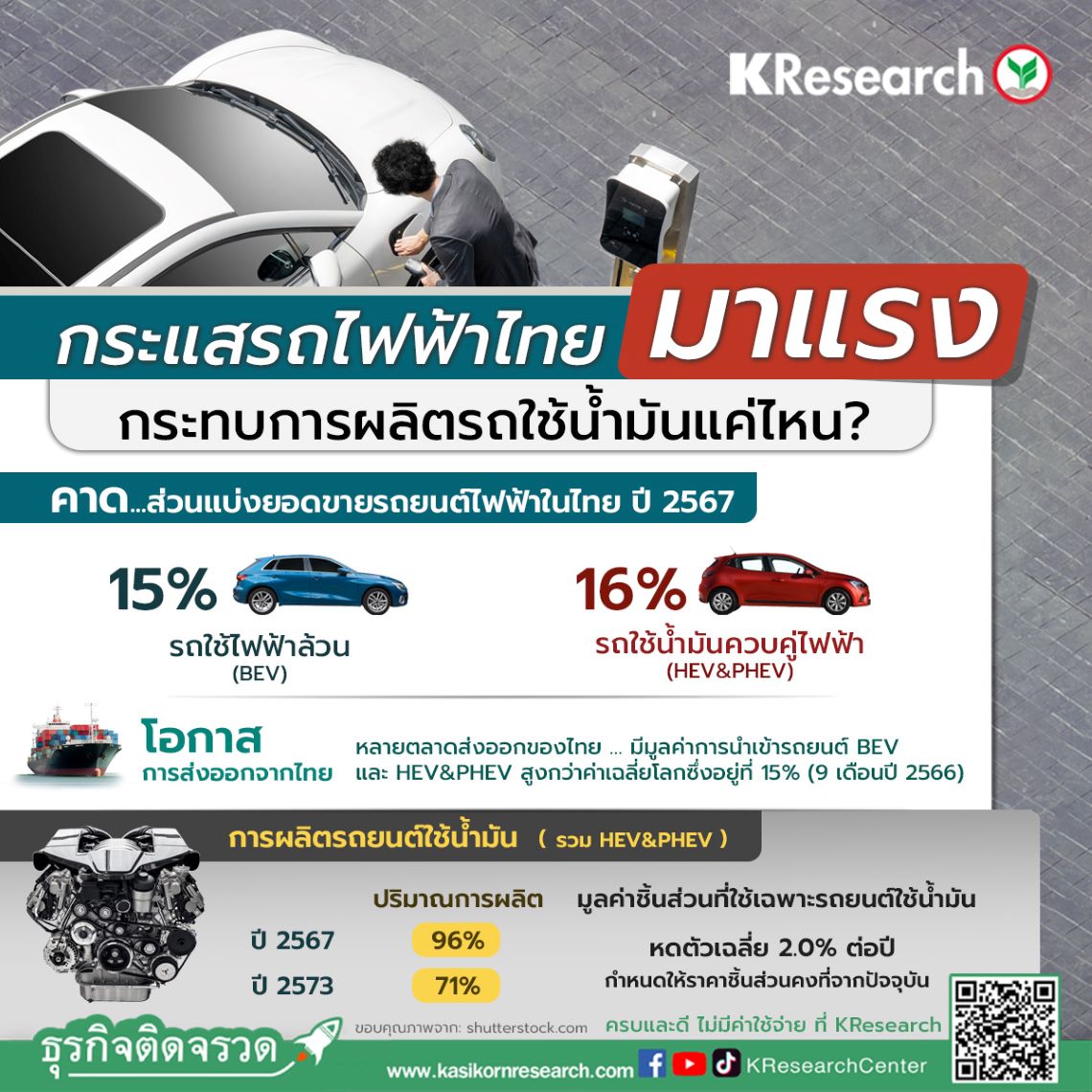 ศูนย์วิจัยกสิกรไทยออกบทวิเคราะห์เกี่ยวกับตลาดรถยนต์ไฟฟ้าล่าสุดระบุว่า ที่ผ่านมาไทยพัฒนาอุตสาหกรรมรถยนต์สันดาปภายใน (ICE) เป็นหลัก แต่ Disruptive Technology อย่างรถยนต์ขับเคลื่อนด้วยไฟฟ้า และการหนุนของภาครัฐที่ทำให้เกิดการเปลี่ยนผ่านสู่เทคโนโลยีดังกล่าว ได้ทำให้ค่ายรถหันพัฒนารถยนต์ไฟฟ้าที่ใช้แบตเตอรี่ล้วน (BEV) กับ รถยนต์ใช้น้ำมันร่วมกับระบบไฟฟ้า (HEV&PHEV) ในไทยมากขึ้น ซึ่งในระยะยาวน่าจะกระทบกับการผลิตรถยนต์ใช้น้ำมันและชิ้นส่วนที่เกี่ยวข้องในไทยอย่างไม่อาจเลี่ยง