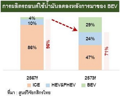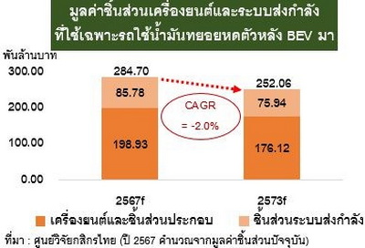 ในระยะยาว รถยนต์ BEV มีโอกาสเติบโตสูงขึ้นอีกมาก และน่าจะทำให้การผลิตรถยนต์ใช้น้ำมัน ซึ่งรวมถึง HEV&PHEV ด้วย มีแนวโน้มหดตัวลง โดยในปี 2573 คาดว่าอาจเหลือส่วนแบ่งเพียง 71% ลดลงจากที่คาดว่าจะมีส่วนแบ่ง 96% ในปี 2567 นี้ ซึ่งก็จะกระทบต่อไปยังมูลค่าชิ้นส่วนที่ใช้เฉพาะกับรถยนต์ใช้น้ำมันที่จะหดตัวด้วยอัตราเฉลี่ยที่ 2.0% ต่อปี จากในปี 2567 ที่ 284,700 ล้านบาท มาอยู่ที่ 252,060 ล้านบาทในปี 2573