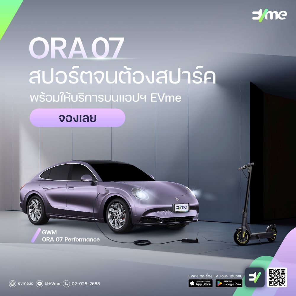 EVme แอพพลิเคชันให้เช่ารถ EV เบอร์ 1 ของไทยเติมรถเข้าพอร์ตไม่ขาดสาย ล่าสุดเพิ่ม GWM ORA 07 Performance เข้าพอร์ตอีกรุ่น ชูฟังก์ชัน V2L 3.3 kW เป็นจุดขาย เชื่อทำให้เปลี่ยนวิถีการขับขี่ไปตลอดกาล