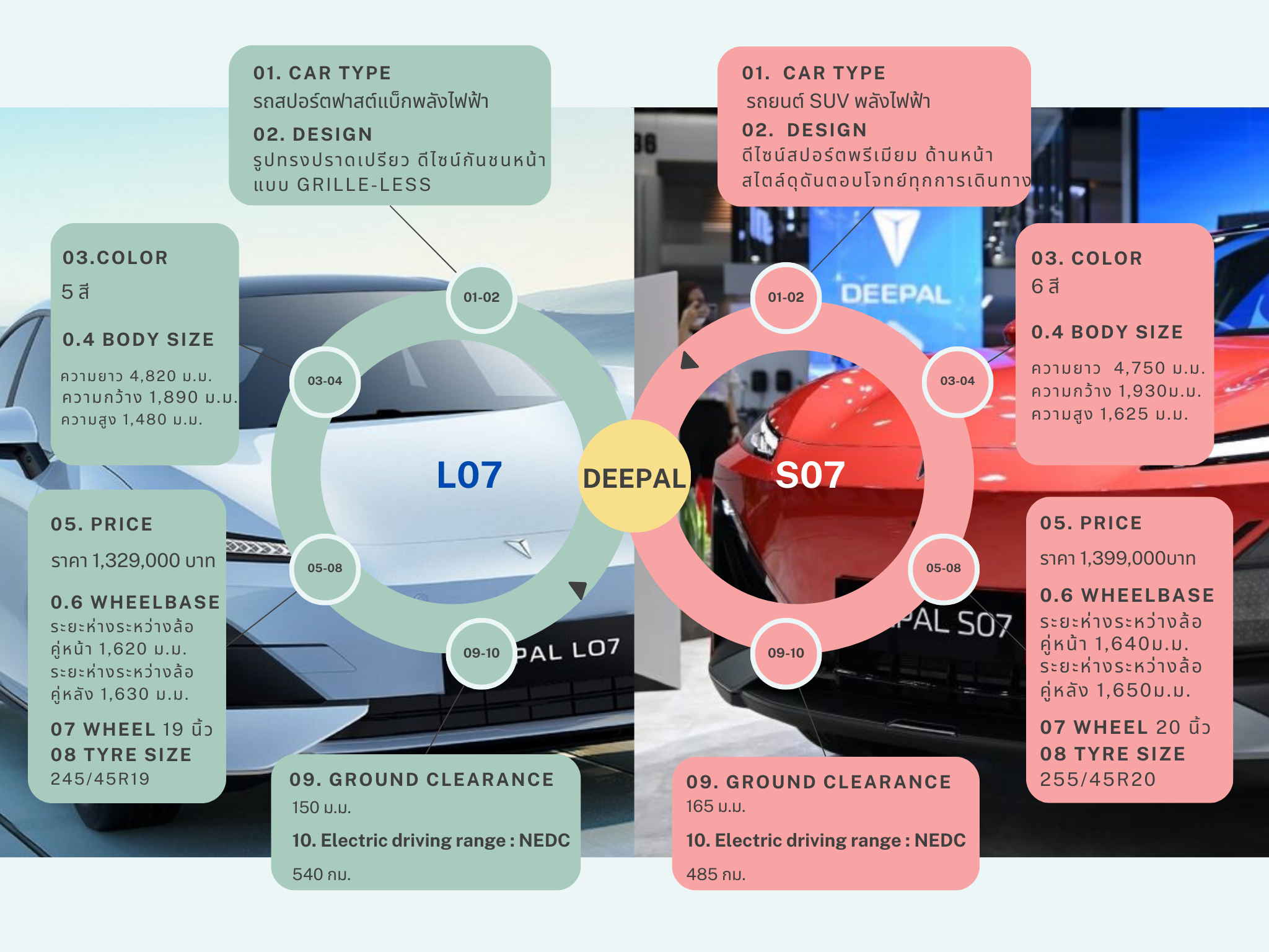 2. DEEPAL L07 เป็นรถสปอร์ตฟาสต์แบ็กพลังไฟฟ้า ขณะที่ S07 เป็น SUV พลังไฟฟ้า ดีไซน์สปอร์ตพรีเมียม