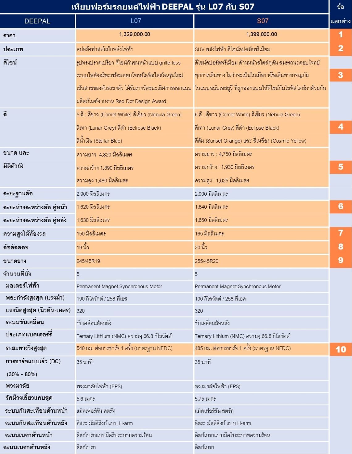 1.DEEPAL S 07 ราคา 1,399,000 บาท สูงกว่า DEEPAL L07 ที่มีราคาจำหน่าย 1,329,000 บาท ประมาณ 70,000 บาท