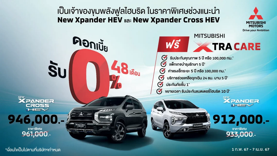 มิตซูบิชิ มอเตอร์ส เปิดตัวรถยนต์ไฟฟ้าไฮบริด Xpander HEV & Xpander Cross HEV จากสายพานการผลิตในไทย ใส่โหมดการขับขี่แบบ EV มาให้จากโรงงาน เคาะราคาเท่ารถน้ำมัน รับประกันแบตเตอรี่ไฮบริด 10 ปี!