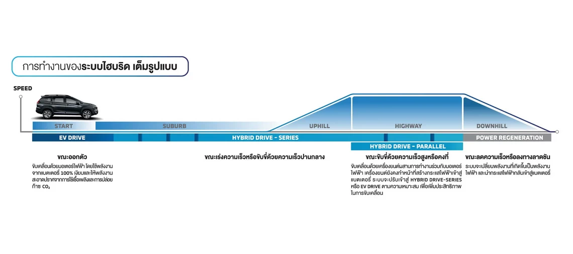 EV driving การขับขี่แบบไฮบริดจะเริ่มทำงานเมื่อขับขี่ด้วยความเร็วสูง เพื่อให้ทำงานโดยใช้เครื่องยนต์โดยมีตัวช่วยจากมอเตอร์