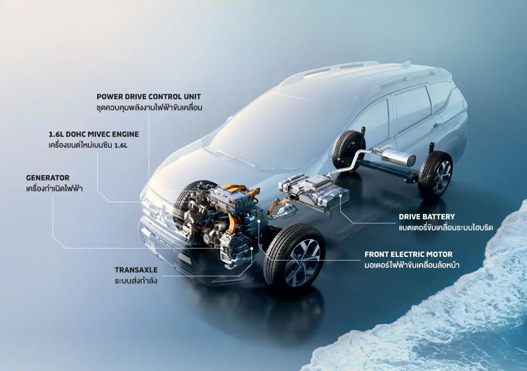 รถยนต์รุ่นนี้เป็นระบบ HEV ผสานเข้ากับตัวถังรถยนต์อเนกประสงค์ขนาดเล็ก ที่ส่งมอบ e : MOTION ประสบการณ์การขับขี่ใหม่ที่เต็มไปด้วยพลังและความมั่นใจในทุกเส้นทาง โดดเด่นด้วย 3 เทคโนโลยีล้ำสมัยของ มิตซูบิชิ มอเตอร์ส ซึ่งผสมผสานพลังของมอเตอร์ไฟฟ้าเข้ากับเครื่องยนต์ใหม่ได้อย่างลงตัว