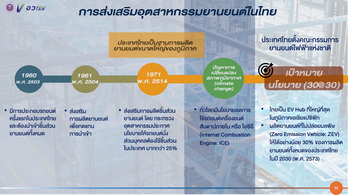 นางสาวศุภมาส อิศรภักดี รัฐมนตรีว่าการกระทรวงการอุดมศึกษาวิทยาศาสตร์ วิจัยและนวัตกรรม (อว.) ประธานในงานแถลงข่าวเปิดตัวนโยบาย อว. For EV กล่าวว่าตามที่นายเศรษฐา ทวีสิน นายกรัฐมนตรี และประธานบอร์ดอีวี เล็งเห็นว่ากระทรวง อว. เป็นกระทรวงสำคัญที่จะมาร่วมขับเคลื่อนโยบายผลักดันให้ประเทศเป็นฐานการผลิตยานยนต์ไฟฟ้าและชิ้นส่วนที่สำคัญอันดับหนึ่งของภูมิภาค และอยู่ใน 10 อันดับแรกของโลก ในช่วงเปลี่ยนผ่านยานยนต์สันดาป (ICE) สู่ยานยนต์ไฟฟ้า (EV) จึงได้แต่งตั้งให้ รมว.อว เป็นคณะกรรมการ นโยบายยานยนต์ไฟฟ้าแห่งชาติ (บอร์ดอีวี) เพิ่มเติมเมื่อวันที่ 8 กุมภาพันธ์ที่ผ่านมา