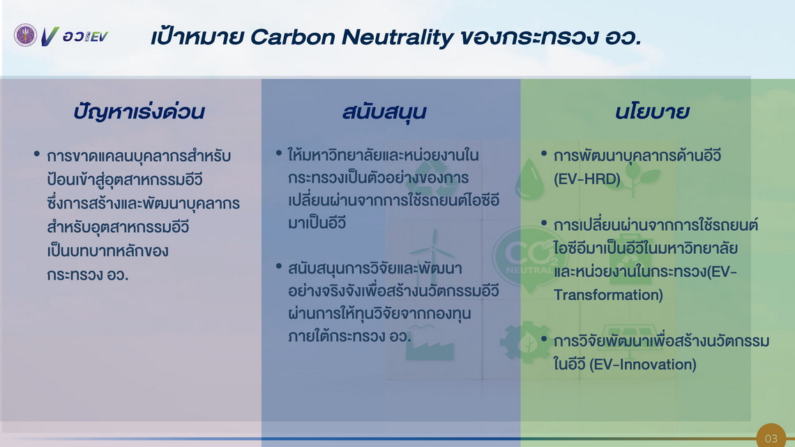ทางกระทรวง อว.เล็งเห็นว่าการที่รัฐบาลตั้งเป้าหมายให้ประเทศไทยเป็น EV HUB ใหญ่ที่สุดในเอเชียนแปซิฟิก โดยมีเป้าหมายผลิตรถ ZEV (Zero Emission Vehicle) หรือยานยนต์ที่ปล่อยมลพิษเป็นศูนย์ให้ได้อย่างน้อยร้อยละ 30 ของการผลิตยานยนต์ทั้งหมดภายในปี 2573 คิดเป็นกำลังการผลิตรถยนต์ประมาณ 725,000 คัน และรถจักรยานยนต์ 675,000 คัน เพื่อสร้างอุตสาหกรรมใหม่ให้กับประเทศ ลดการปล่อยก๊าซคาร์บอนไดออกไซด์แก้ไขความท้าทายด้านสิ่งแวดล้อม และสร้างอนาคตที่ยั่งยืนและเป็นมิตรต่อสิ่งแวดล้อมนั้น ต้องเร่งแก้ปัญหาการขาดแคลนบุคลากรอย่างเร่งด่วน