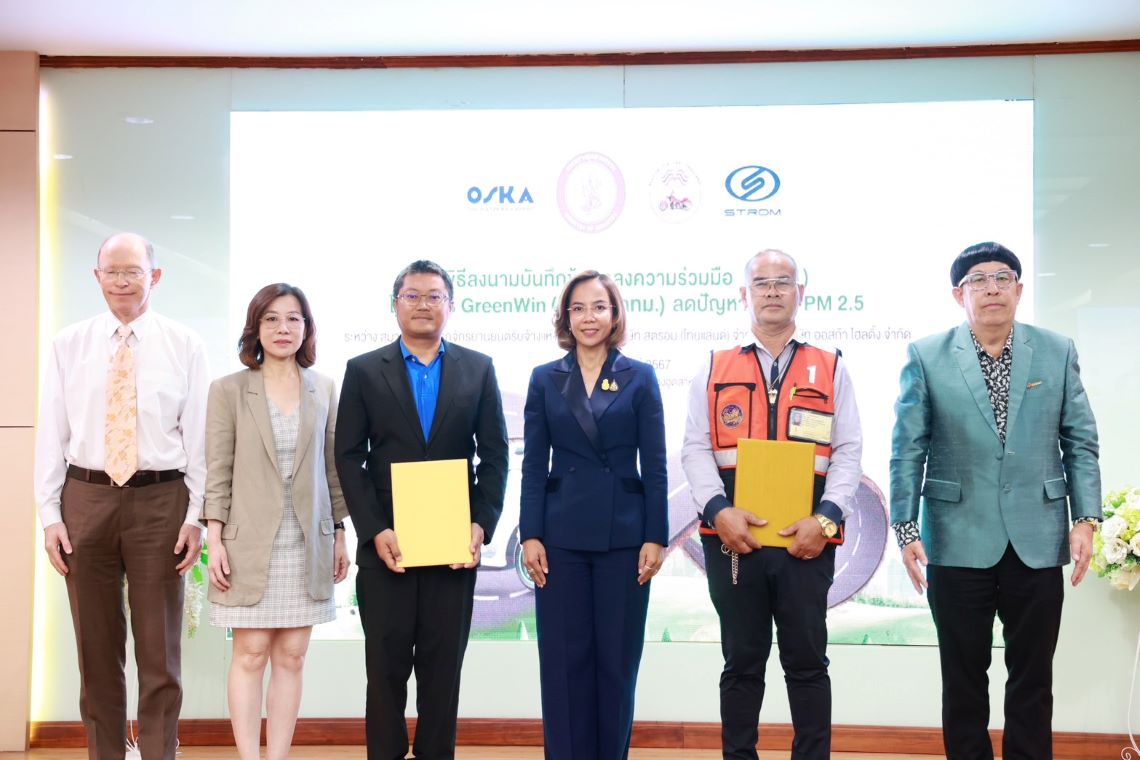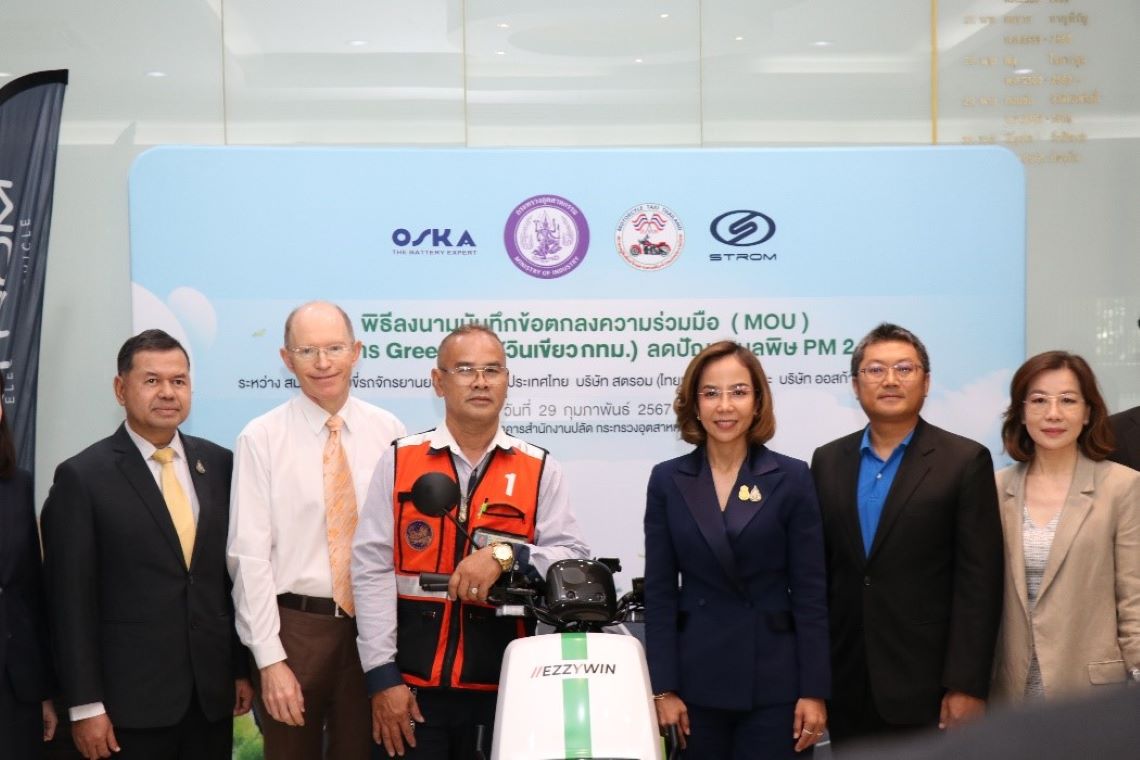 บริษัท สตรอม (ไทยแลนด์) จำกัด และ บริษัท ออสก้า โฮลดิ้ง จำกัด นำโดย พ.ท.ม.ร.ว. พีรานุพงศ์ ภาณุพันธ์ (ที่ห้าจากซ้าย) ประธานเจ้าหน้าที่บริหาร พร้อมด้วย นายเฉลิม ชั่งทองมะดัน (ที่สามจากซ้าย) นายกสมาคมผู้ขับขี่รถจักรยานยนต์แห่งประเทศไทย ได้ลงนามบันทึกข้อตกลงความร่วมมือจัดตั้งโครงการ GreenWin (วินเขียว กทม.) เพื่อสนับสนุนการนำรถจักรยานยนต์ไฟฟ้ามาใช้บริการเป็นรถจักรยานยนต์รับจ้างสาธารณะ เพื่อแก้ไขปัญหามลพิษ PM 2.5 ในกรุงเทพมหานคร ตั้งเป้าหมายสู่ เมืองหลวงไร้มลพิษทางอากาศ ซึ่งได้รับเกียรติจากคุณพิมพ์ภัทรา วิชัยกุล (ที่สี่จากซ้าย) รัฐมนตรีว่าการกระทรวงอุตสาหกรรมเป็นประธานในพิธี โดยมี คุณฟรานซิส นิโคลัส แลนเจนเฟล (ที่สองจากซ้าย) ผู้จัดการฝ่ายพัฒนาธุรกิจ บริษัท โทรีเซนไทย เอเยนต์ซีส์ จำกัด (มหาชน) และคุณบุษราภรณ์ พรไพศาลศักดิ์ (ที่หกจากซ้าย) กรรมการผู้อำนวยการฝ่ายปฏิบัติการบริษัท สตรอมไทยแลนด์ จำกัด ร่วมเป็นสักขีพยานในพิธี ณ อาคารสํานักงานปลัด กระทรวงอุตสาหกรรม