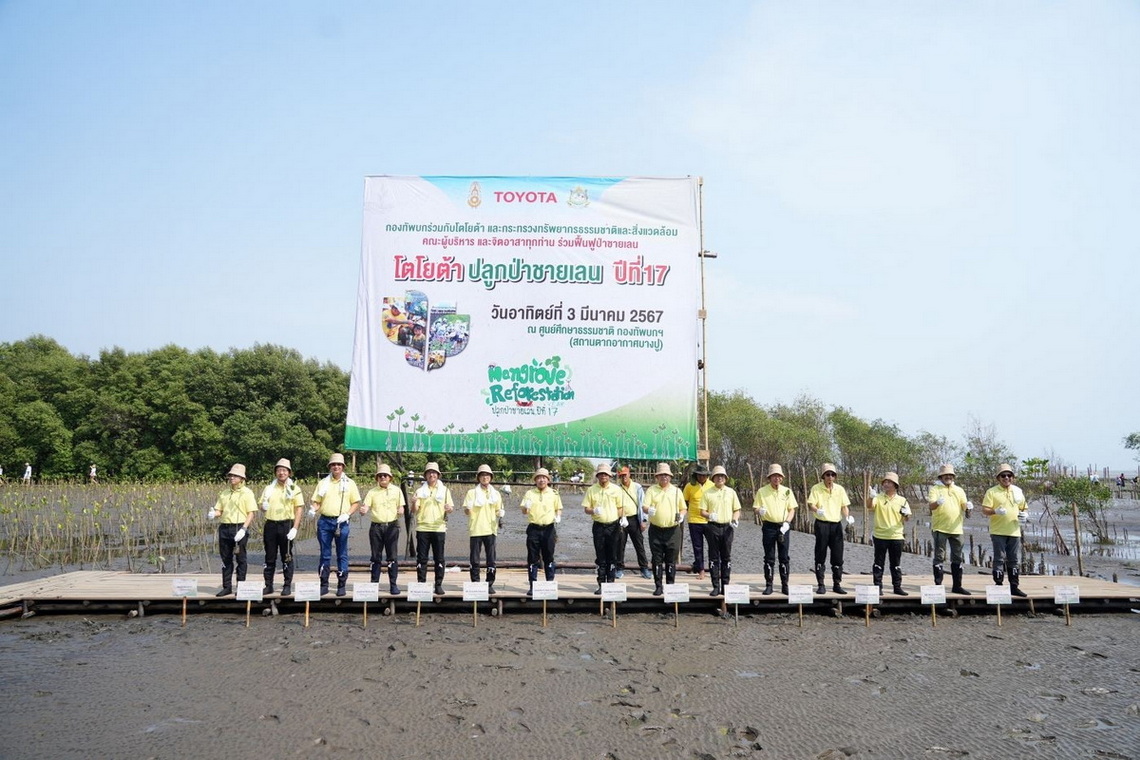 นายวัฒนา เจริญจิตร นายอำเภอเมืองสมุทรปราการ พลตรี ธวัช ชาลีรัตน์ รองเจ้ากรมพลาธิการทหารบก และ นายสมคิด ประดิษฐกำจรชัย รองกรรมการผู้จัดการใหญ่ บริษัท โตโยต้า มอเตอร์ ประเทศไทย จำกัด พร้อมด้วยคณะผู้บริหารระดับสูงของโตโยต้า บริษัทในเครือฯ ผู้ผลิตชิ้นส่วนโตโยต้า ผู้แทนจำหน่ายโตโยต้า ตลอดจนหน่วยงานพันธมิตรทั้งภาครัฐ ภาคเอกชน และประชาชน ร่วมปลูกพันธุ์ไม้ชายเลนจำนวน 50,000 ต้น เพื่อเป็นส่วนหนึ่งในการมุ่งสู่เป้าหมาย สร้างความเป็นกลางทางคาร์บอน ภายใต้กิจกรรม “โตโยต้าปลูกป่าชายเลน ปีที่ 17” ณ สถานตากอากาศบางปู จังหวัดสมุทรปราการ เมื่อวันที่ 3 มีนาคม 2567