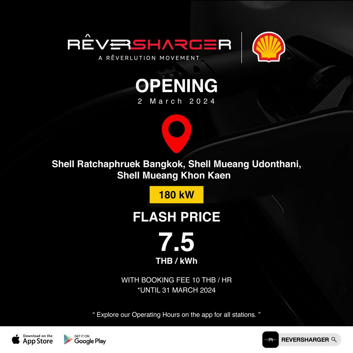 REVERSHARGER เปิดจุดบริการ DC ฟาสต์ชาร์จ 180 กิโลวัตต์อีก 3 แห่ง ในปั๊ม SHELL สาขาราชพฤกษ์ และรุกตลาดสถานีชาร์จในภาคอีสานที่ปั๊มเชลล์อุดรและขอนแก่น จัดโปรโมชั่นค่าชาร์จ 7.5 บาท/กิโลวัตต์ ค่าธรรมเนียมการจอง 10 บาท/ชั่วโมง ถึง 31 มี.ค. 2567