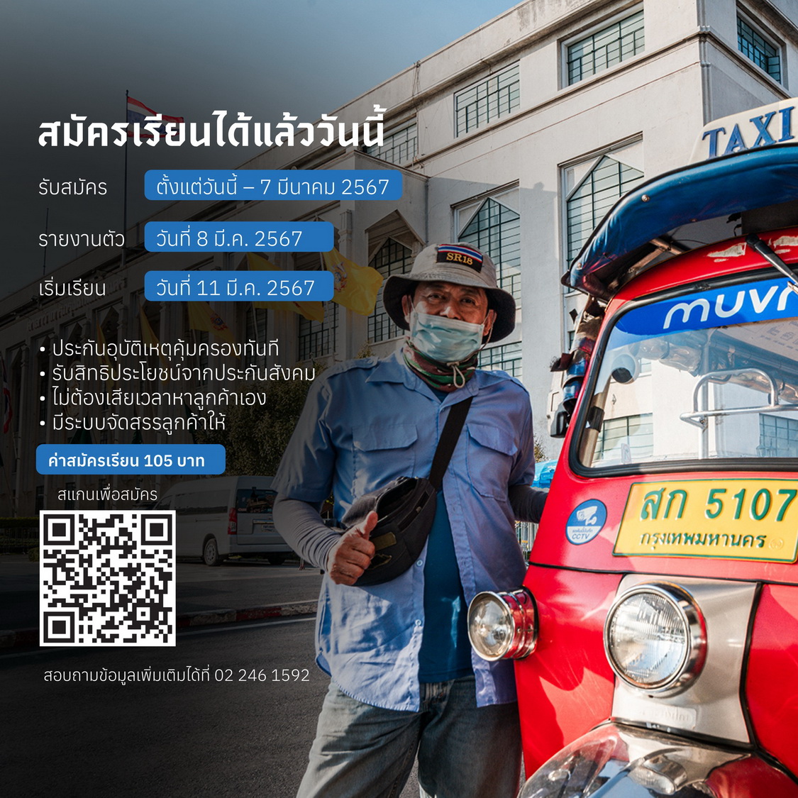 กทม. จับมือ MUVMI เปิดหลักสูตรพนักงานขับรถยนต์สามล้อไฟฟ้าในสำนักงานและบริการสาธารณะ รุ่นที่ 2 รับสมัครถึง 7 มีนาคม 2567 รายงานตัววันที่ 8 เริ่มเรียน 11 มี.ค. 2567 เผยรายได้เฉลี่ย 19,000–22,000 บาท/เดือน
