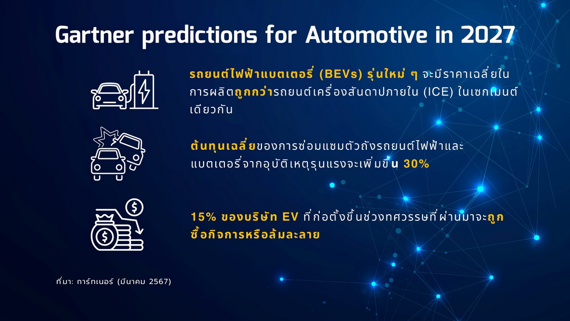 - ปี 2567 ตลาดรถยนต์ไฟฟ้าจะยังเติบโตต่อเนื่อง โดยการ์ทเนอร์คาดการณ์ปีนี้จะมียอดจัดส่งรถยนต์ไฟฟ้าสูงถึง 18.4 ล้านคัน และเพิ่มเป็น 20.6 ล้านคันในปี 2568