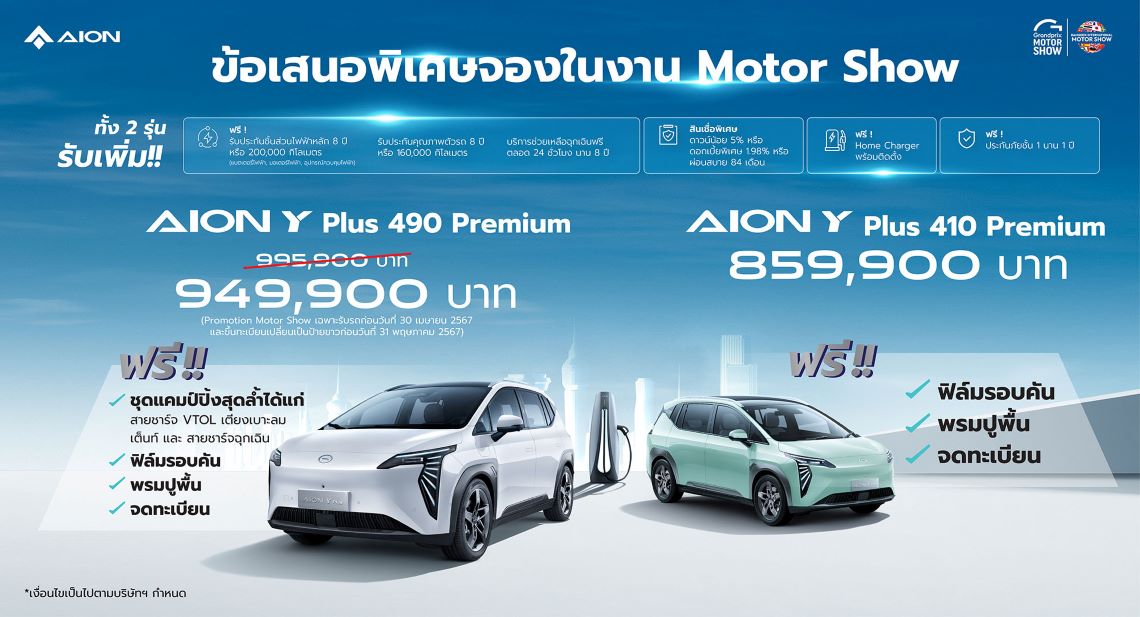 พิเศษ! สำหรับลูกค้าที่จองรถยนต์ไฟฟ้า AION Y Plus 410 Premium และ AION Y Plus 490 Premium ภายในงาน บางกอก อินเตอร์เนชั่นแนล มอเตอร์โชว์ ครั้งที่ 45 ระหว่างวันที่ 27 มีนาคม ถึงวันที่ 7 เมษายน 2567 จะได้รับโปรโมชั่นและสิทธิประโยชน์ ดังนี้