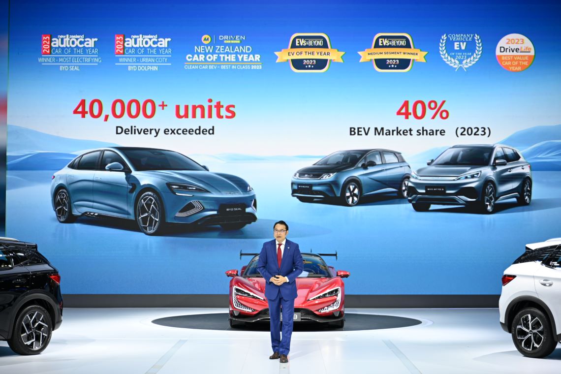 นายหลิว เสวียเลี่ยง ผู้จัดการทั่วไป ฝ่ายขายประจำภูมิภาคเอเชียแปซิฟิก บริษัท บีวายดี ออโต้ อินดัสทรี จำกัด กล่าวว่า “งานบางกอก อินเตอร์เนชั่นแนล มอเตอร์โชว์ ครั้งที่ 45 นี้ BYD มาพร้อมทัพยนตรกรรมที่อัดแน่นด้วยดีไซน์และนวัตกรรมล้ำสมัย นำโดย New BYD ATTO 3 Extended รุ่นปี 2024 ร่วมกับแบรนด์ BAO 5, DENZA และ YANGWANG มาจัดแสดงให้ชาวไทยได้สัมผัสคันจริงในบูธ BYD บนพื้นที่กว่า 2,500 ตารางเมตร นับเป็นบูธแบรนด์เดียวขนาดใหญ่ที่สุดในงาน รองรับการจัดแสดงรถยนต์พลังงานไฟฟ้ามากถึง 29 คัน อีกหนึ่งความพิเศษในปีนี้ คือการพลิกโฉมบูธด้วยการตกแต่งในธีมฟุตบอล UEFA EURO 2024 ในฐานะที่ BYD เป็นผู้สนับสนุนหลักอย่างเป็นทางการของการแข่งขันฟุตบอลชิงแชมป์แห่งชาติยุโรป 2024 โดย BYD ยังเตรียมของสมนาคุณสุดพิเศษมามอบให้ลูกค้าอีกด้วย”