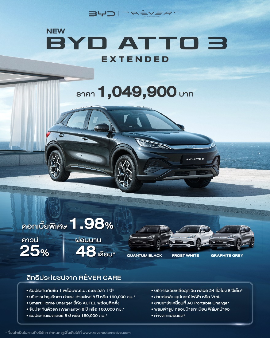 นางสาวประธานพร พรประภา รองประธานเจ้าหน้าที่บริหาร กลุ่มธุรกิจเรเว่ กล่าวว่า “สำหรับลูกค้าที่จอง BYD ATTO 3 Extended รุ่นปี 2024 ที่เปิดตัวพร้อมประกาศราคาอย่างเป็นทางการภายในงานบางกอก อินเตอร์เนชั่นแนล มอเตอร์โชว์นี้ จะได้รับสิทธิพิเศษ RÊVER Care ประกอบด้วยประกันภัยชั้น 1 พร้อม พ.ร.บ. นาน 1 ปี, Smart Home Charger ยี่ห้อ AUTEL พร้อมบริการติดตั้ง, บริการบำรุงรักษา ค่าแรง ค่าอะไหล่ 8 ปี หรือ 160,000 กม., รับประกันแบตเตอรี่ 8 ปี หรือ 160,000 กม. และสิทธิประโยชน์อื่นๆ กว่า 10 รายการ รวมทั้งของสมนาคุณสุดพิเศษจากลิขสิทธิ์แท้ UEFA EURO 2024