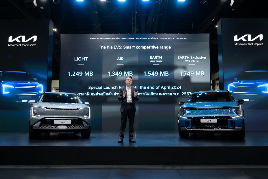 “The Kia EV5” เป็นรถยนต์เอสยูวีขนาดกลางไฟฟ้า 100% ที่ให้ความอเนกประสงค์อย่างเต็มรูปแบบผสานความคล่องตัวและความสะดวกสบายเข้ากับเทคโนโลยีขั้นสูง สมรรถนะแรงเต็มอัตรา มาพร้อมฟีเจอร์ความปลอดภัย มีระยะขับขี่ไกลที่สุดในเซกเมนต์เดียวกัน โดยไลน์อัปของ “The Kia EV5” ที่จะวางจำหน่ายในตลาดประเทศไทยประกอบด้วย 4 รุ่นย่อย พร้อมราคาพิเศษช่วงเปิดตัวถึงวันที่ 30 เมษายน พ.ศ.2567 ได้แก่ The Kia EV5 Light ราคา 1,249,000 บาท The Kia EV5 Air ราคา 1,349,000 บาท The Kia EV5 Earth Long Range ราคา 1,549,000 บาท และ The Kia EV5 Earth Exclusive AWD ราคา 1,749,000 บาท