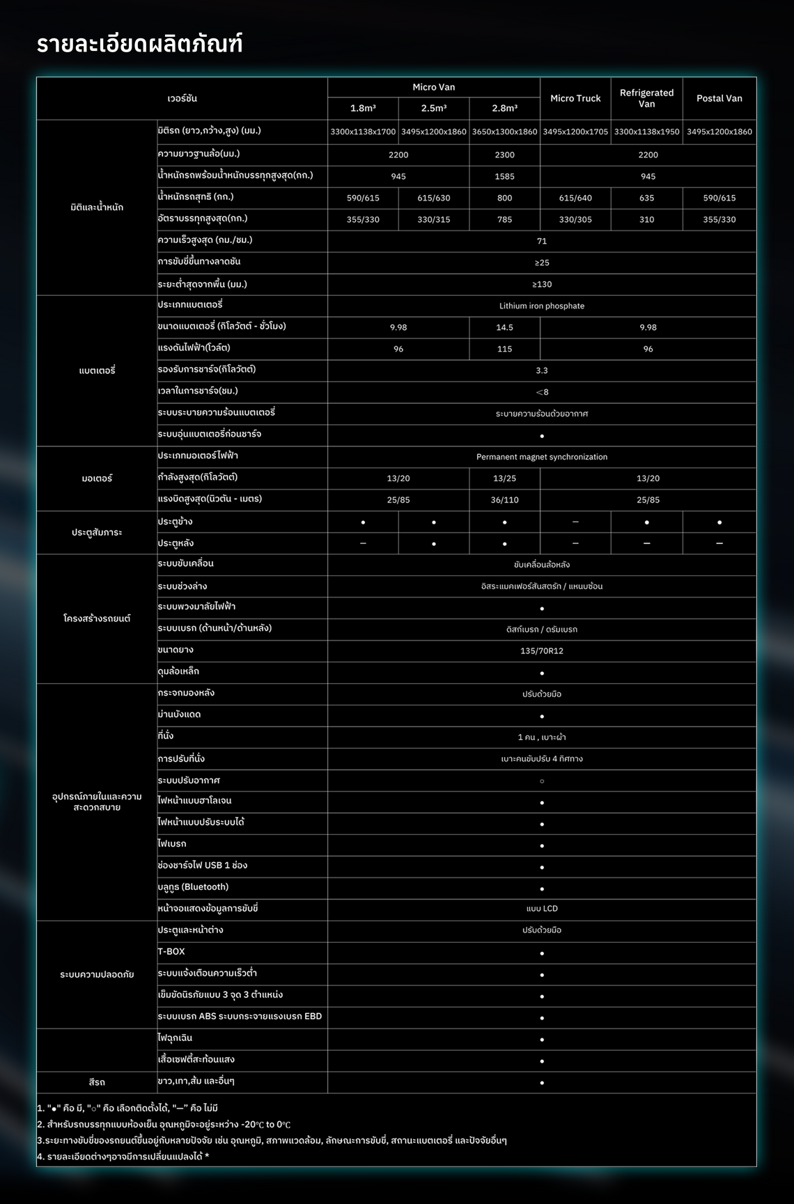 - Refrigerated Van รถบรรทุกไฟฟ้าควบคุมอุณหภูมิ หรือรถเย็น อำนวยความสะดวกในธุรกิจการขนส่งอาหาร วัตถุดิบ ซึ่งจะตอบโจทย์ภาคธุรกิจอุปโภค บริโภคของคนไทย