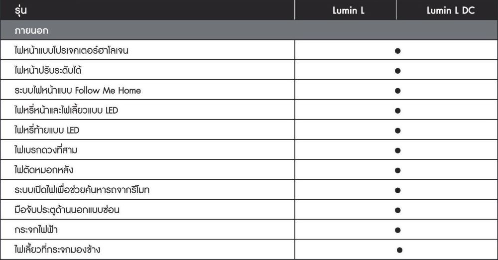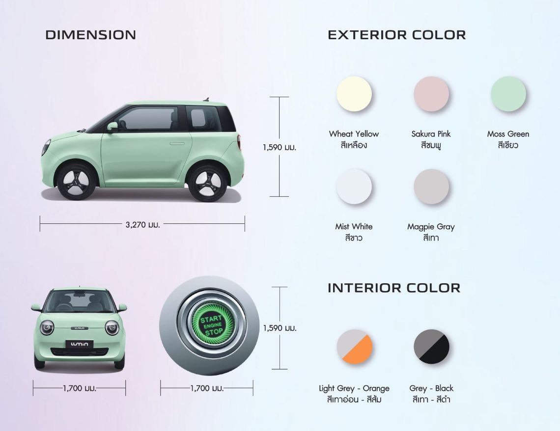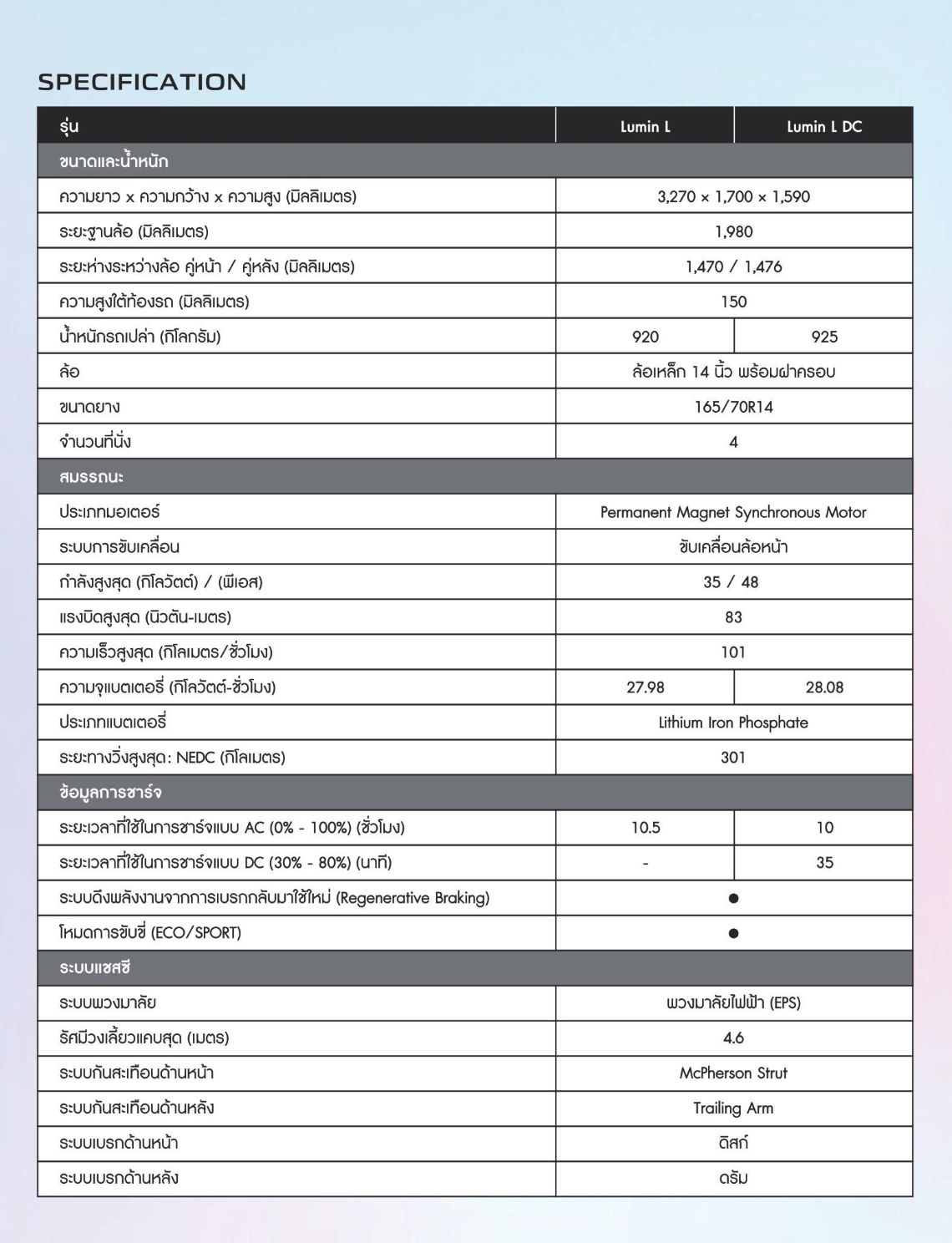 รถยนต์ไฟฟ้า LUMIN เป็น EV City Car ที่ถูกสร้างสรรค์ให้แตกต่างอย่างมีสไตล์ ด้วยดีไซน์ทรงกล่อง ให้อารมณ์สนุก เส้นสายเรียบง่ายแต่แฝงด้วยความทันสมัยเหมาะสำหรับคนรุ่นใหม่ มีให้เลือก 2 รุ่น คือ LUMIN รุ่น L DC ราคา 499,000 บาท กับรุ่น LUMIN L ที่เคาะราคาเพียง 479,000 บาท