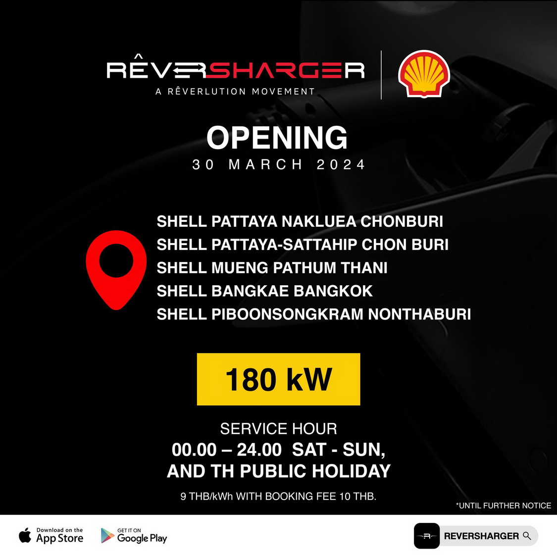 REVERSHARGER เปิดสถานีชาร์จในปั๊ม SHELL เพิ่มอีก 2 สาขา บริการด้วย DC ฟาสต์ชาร์จ 180 กิโลวัตต์ ค่าบริการชาร์จ 9 บาท/กิโลวัตต์ ค่าธรรมเนียมการจอง 10 บาท/ชั่วโมง ให้บริการ 24 ชั่วโมง ทุกวัน เปิดให้บริการแล้ว ที่