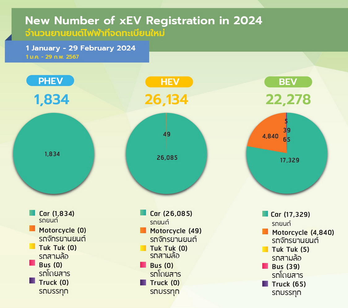 สถิติการจดทะเบียนยานยนต์ไฟฟ้าประเภท Battery Electric Vehicle (BEV) 2 เดือนแรก ปี 2567 ตั้งแต่ 1 ม.ค. 2567 ถึง 29 ก.พ. 2567 มีจำนวน 22,278 คัน แยกเป็นรถยนต์นั่งไฟฟ้า 100% จำนวน 17,329 คัน รถมอเตอร์ไซค์ไฟฟ้า 100% จำนวน 4,840 คัน รถตุ๊กตุ๊กไฟฟ้า 100% จำนวน 5 คัน รถบัสโดยสารไฟฟ้า 100% จำนวน 39 คัน รถบรรทุกไฟฟ้า 100% จำนวน 65 คัน