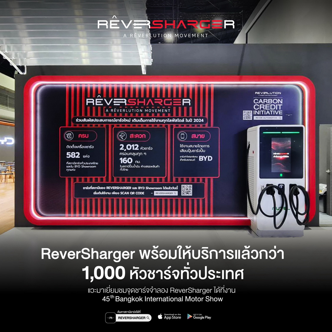 ส่วนสถานีชาร์จ ReverSharger ขยายแล้ว 582 แห่ง ทั่วประเทศและตามโชว์รูม BYD ติดตั้งหัวชาร์จแล้วกว่า 2,012 หัวชาร์จ ครอบคลุมทุกๆระยะทาง 160 กม.