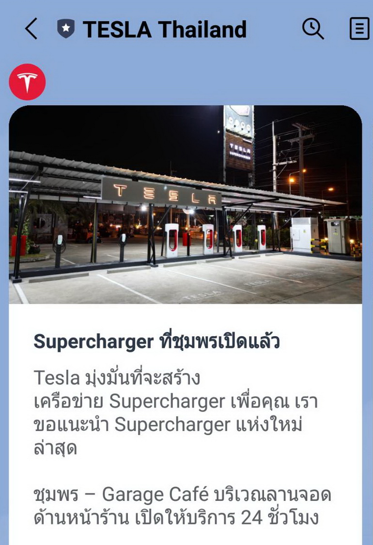 ลงใต้แบบแพ็คคู่! เทสลา ประเทศไทย ขยาย TESLA SUPERCHARGE STATION ลงสู่ภาคใต้เป็นครั้งแรก ประเดิมที่ Bluport Hua Hin เลขที่ 8 89 ถ.เพชรเกษม อ.หัวหิน จ.ประจวบคีรีขันธุ์ ให้บริการด้วยเครื่องซูเปอร์ชาร์จขนาด 250 กิโลวัตต์ จำนวน 3 เครื่อง รองรับระบบชาร์จ CCS ให้บริการทุกวัน ตลอด 24 ชั่วโมง มีสิ่งอำนวยความสะดวกครบครัน ทั้ง ร้านอาหาร จุดชอปปิ้ง ห้องน้ำ