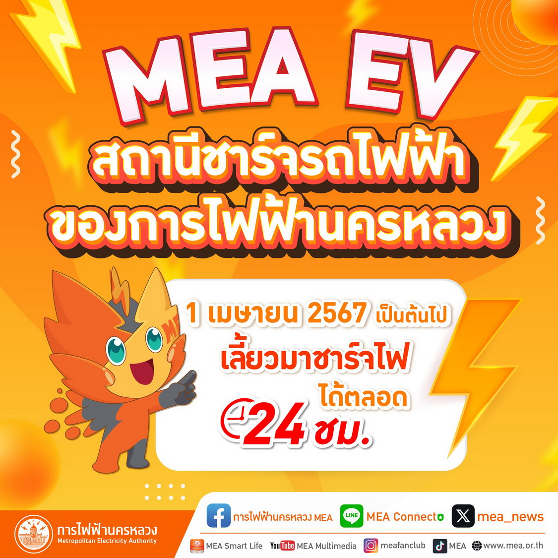 นอกจากนี้ MEA EV สถานีชาร์จรถไฟฟ้าของการไฟฟ้านครหลวง ได้เริ่มเปิดให้บริการชาร์จไฟได้ตลอด 24 ชั่วโมง ตั้งแต่ 1 เมษายน 2567 ที่ผ่านมา