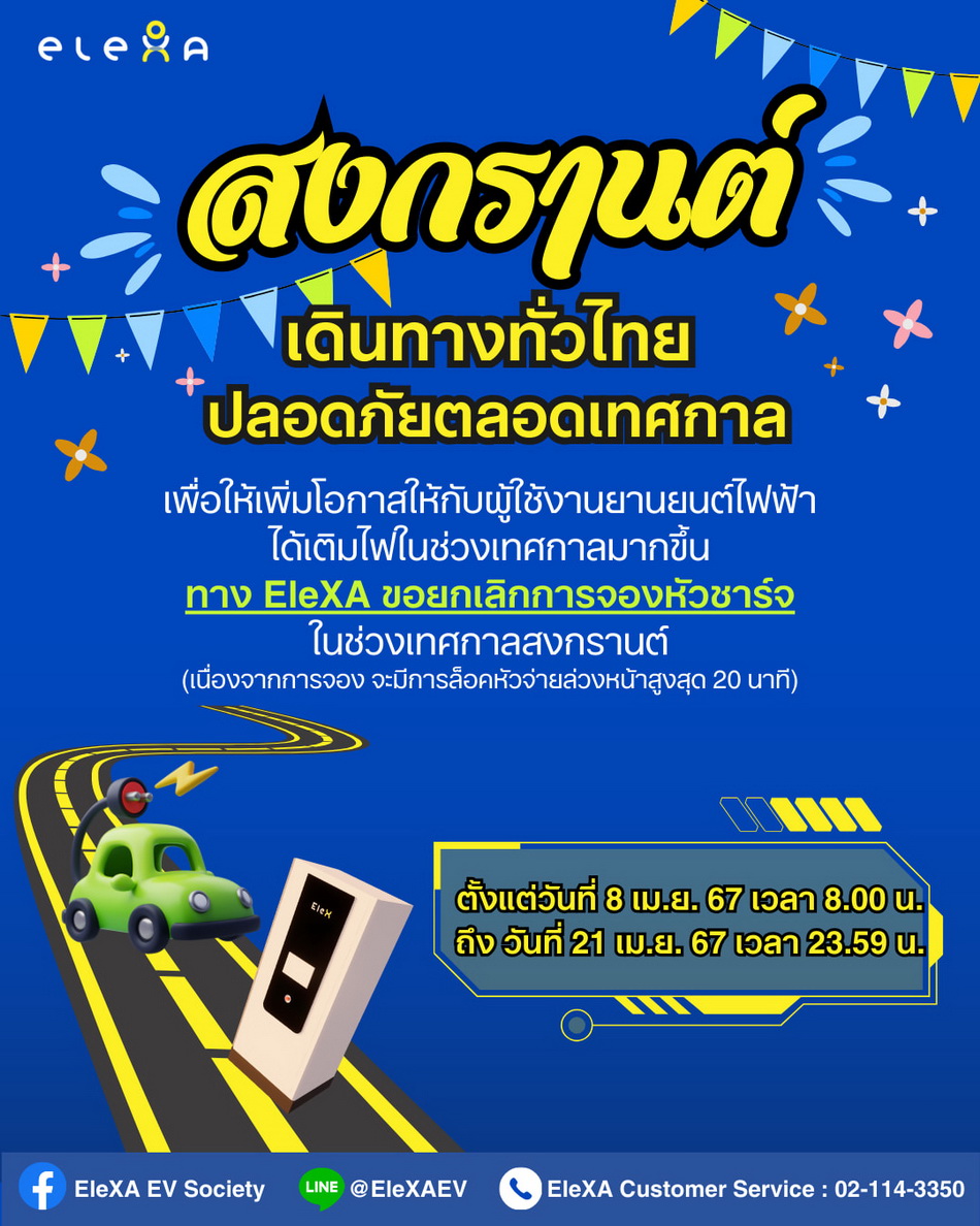 EleXA แจ้งยกเลิกการจองช่วงเทศกาลสงกรานต์ เพื่อเพิ่มโอกาสให้ผู้ใช้งานยานยนต์ไฟฟ้าได้ชาร์จไฟในช่วงเทศกาลมากขึ้น เนื่องจากเมื่อทำการจอง ระบบจะล็อคหัวจ่ายล่วงหน้าสูงสุด 20 นาที โดยยกเลิกการจองในช่วงเทศกาลสงกรานต์ไปจนถึงวันที่ 21 เมษายน 2567 เวลา 23.59 น.