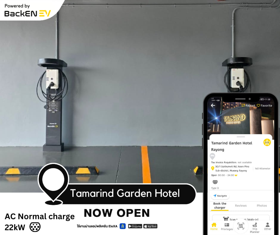 อีกสถานีเปิดที่ระยอง...ที่ Tamarind Garden Hotel ให้บริการทั้งห้องพักและสถานีชาร์จ รองรับรถยนต์ไฟฟ้าด้วย AC Normal Charge ขนาด 22 kW จำนวน 2 หัวชาร์จ อัตราค่าบริการ 8.0 บาท/kWh