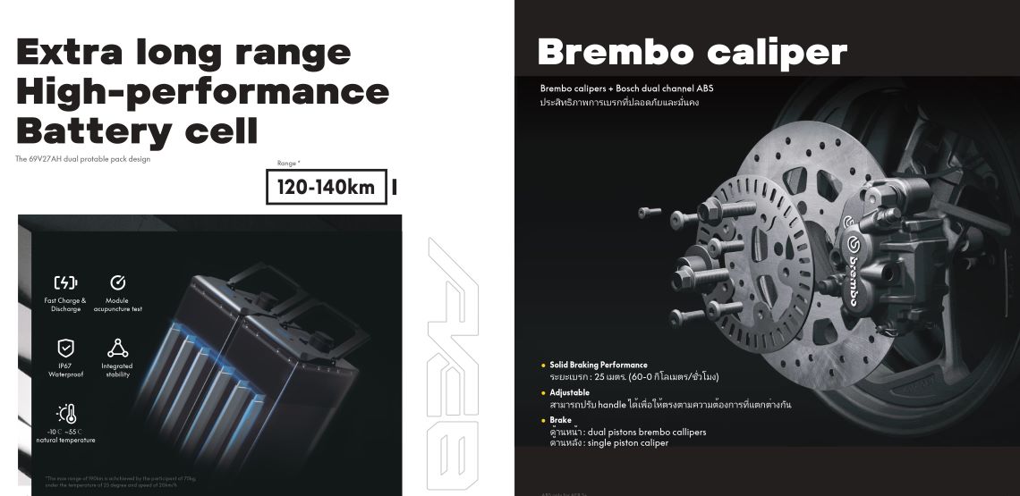 การออกแบบและการผลิตให้ความสำคัญในเรื่องความปลอดภัย มีระบบเบรก ABS ทั้งหน้า-หลัง เลือกใช้ปั๊ม Brembo แบรนด์เบรกระดับโลก ที่นิยมใช้ในรถพอร์ช เบนซ์ หรือบีเอ็มดับพลิวรุ่นสูงๆ แต่ถ้าเป็นมอเตอร์ไซค์ก็จะเป็นกลุ่มซูเปอร์ไบค์ ส่วนพาร์ทที่นำมาประกอบเป็นมอเตอร์ไซค์สมรรถนะสูงจะเป็นสินค้าแบรนด์เนมทั้งคัน โช๊คจะเป็น KYB ของญี่ปุ่น สายพาน Continental