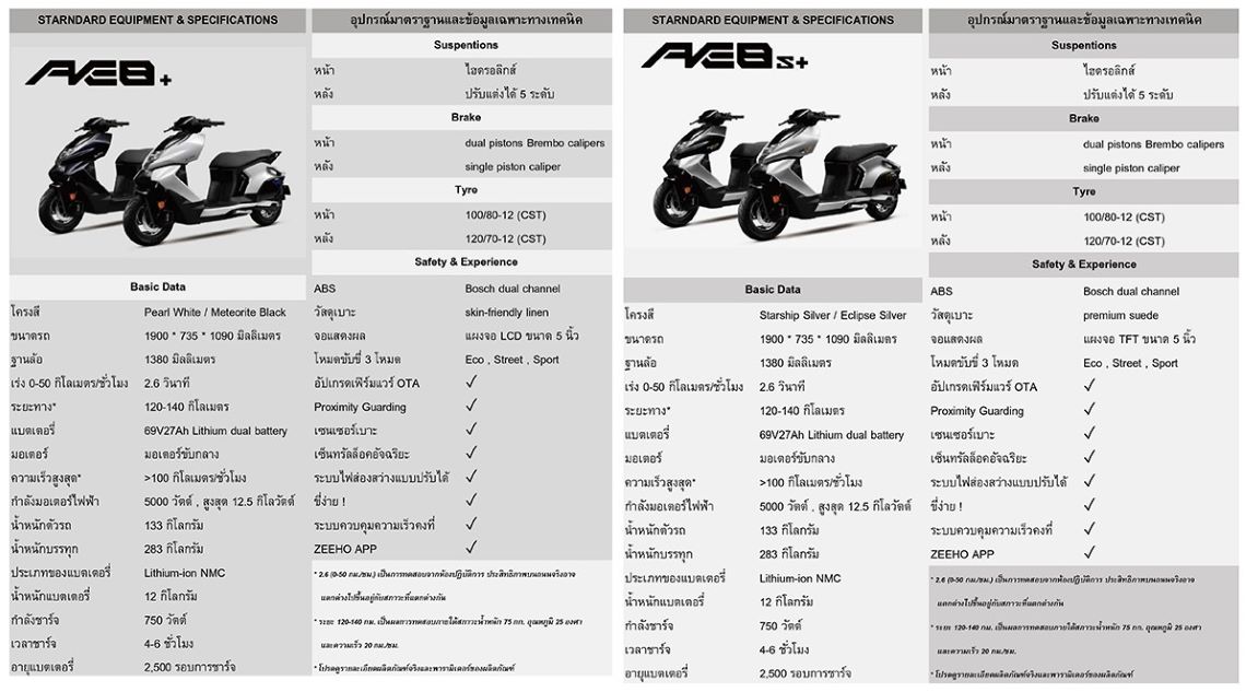 “รุ่นขายดีที่สุดคือตัวท็อปสุด AE8 S+ จริงๆ แล้วอารมณ์การขับขี่เหมือนกับ AE8+ แตกต่างกันที่หน้าจอรุ่นท็อปจะเป็นจอสี และให้ประกันเพิ่มอีกหมื่นกว่าบาท รุ่นนี้มีชื่อเสียงในกลุ่มมอเตอร์ไซค์ไฟฟ้าสมรรถนะสูงเพราะสเปคใกล้เคียงบีเอ็มดับบลิว ซึ่งราคา 850,000 บาท สปีดต้นเท่ากัน แต่แรงปลายไม่เท่า เพราะบีเอ็มมอเตอร์ใหญ่กว่า แต่อย่างอื่นใกล้เคียงกัน” ทีมการตลาด ZEEHO บอกถึงจุดเด่นของ AE8 S+