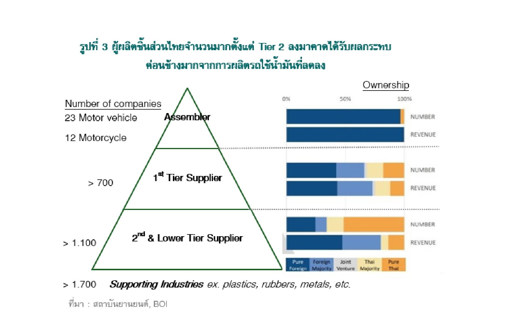 อีกสิ่งสำคัญไม่แพ้กันที่ภาครัฐอาจต้องเร่งดำเนินการ คือ การเตรียมการช่วยเหลือธุรกิจที่อยู่ในซัพพลายเชนของรถยนต์ใช้น้ำมัน ให้สามารถปรับตัวได้ทันกับการมาของรถยนต์ BEV และเทคโนโลยีอื่นที่เปลี่ยนแปลงรวดเร็ว เพื่อลดผลกระทบต่อเศรษฐกิจโดยรวมและตลาดแรงงาน โดยเฉพาะในกลุ่มผู้ผลิตชิ้นส่วนตั้งแต่ Tier 2 ลงมา ซึ่งเป็นผู้ประกอบการไทยที่อยู่ในซัพพลายเชนค่ายรถใช้น้ำมันต่างชาติ และมีความสามารถในการปรับตัวด้านเทคโนโลยีน้อยกว่ากลุ่มอื่น
