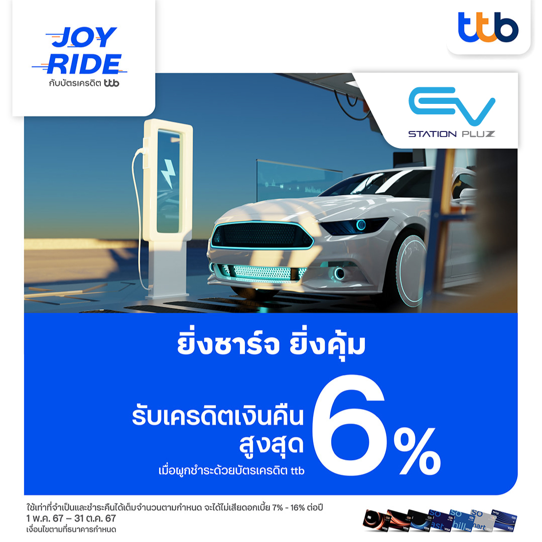 EV Station PluZ จับมือ ttb จัดโปรฯรับเครดิตเงินคืนสูงสุด 6% เมื่อชาร์จผ่านแอป EV Station PluZ และจ่ายค่าชาร์จผ่านบัตรเครดิต ttb ระหว่าง 1 พ.ค. 2567 – 31 ต.ค. 2567