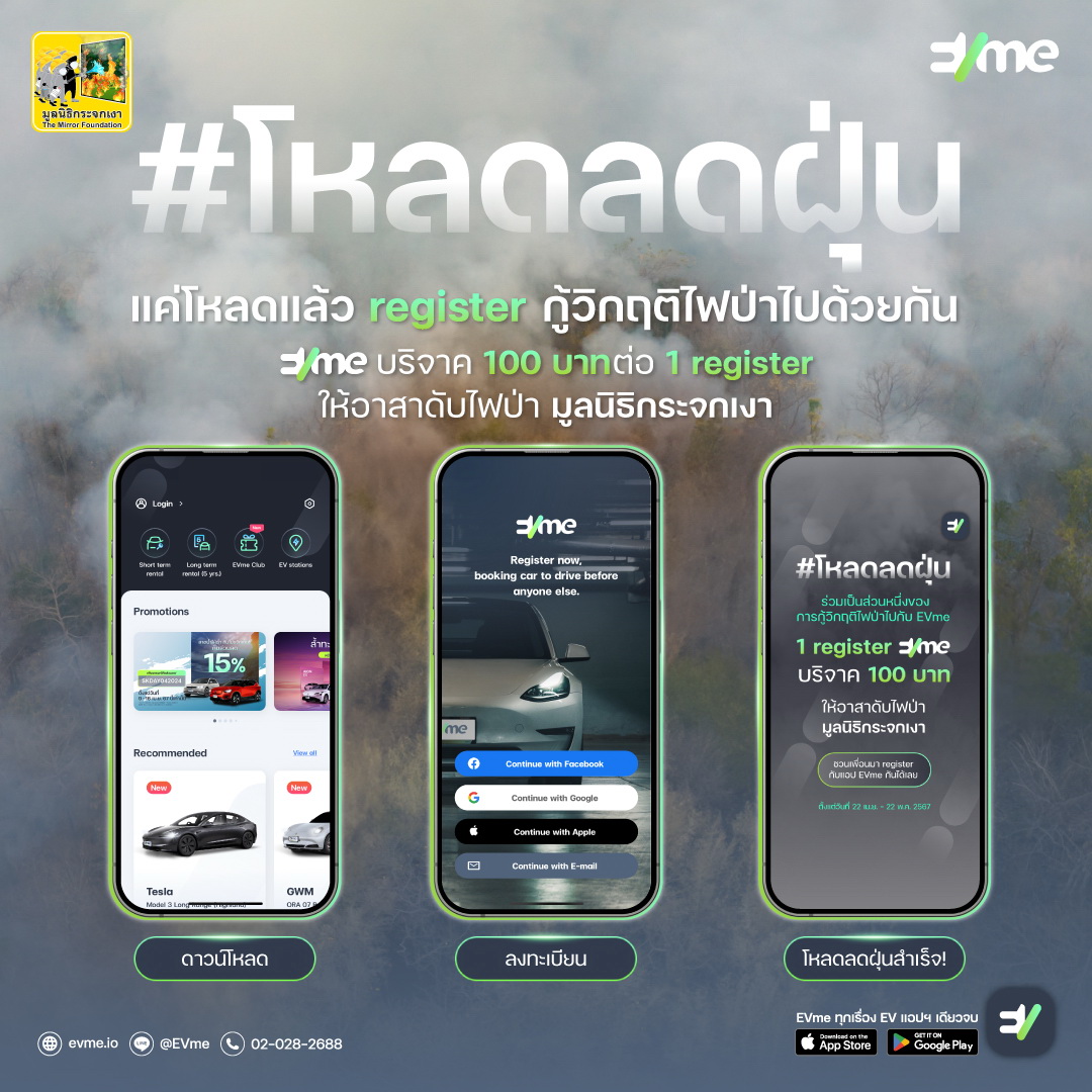 EVme ออกแคมเปญ “โหลดลดฝุ่น” โดย ทุกๆ 1 register ที่โหลดแอพพลิเคชั่น ทาง EVme จะร่วมบริจาคให้กับ ‘อาสาดับไฟป่า มูลนิธิกระจกเงา’ 100 บาท สมทบทุนดับไฟป่า เพื่อจัดหารถมอเตอร์ไซค์วิบากไฟฟ้าเพื่อการเข้าถึงพื้นที่อย่างรวดเร็ว เครื่องเป่าใบไม้สำหรับทำแนวกันไฟ และเสริมเสบียงให้กองทัพดับไฟที่อยู่แนวหน้า ช่วยดับวิกฤติไฟป่าและแก้ปัญหาฝุ่น PM 2.5