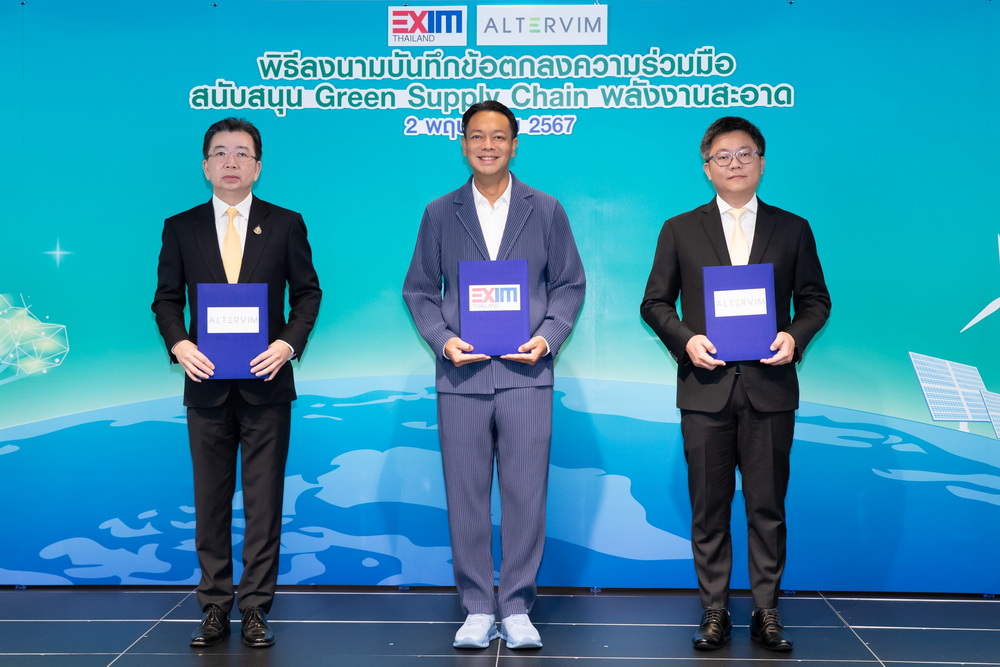 ดร.รักษ์ วรกิจโภคาทร กรรมการผู้จัดการ ธนาคารเพื่อการส่งออกและนำเข้าแห่งประเทศไทย (EXIM BANK) นายบุญชัย โอภาสเอี่ยมลิขิต ประธานธุรกิจ-สหรัฐอเมริกา สหภาพยุโรป และอังกฤษ เครือเจริญโภคภัณฑ์ (CP) และนายสมบูรณ์ เลิศสุวรรณโรจน์ ประธานเจ้าหน้าที่บริหาร บริษัท อัลเตอร์วิม จำกัด (Altervim) ร่วมลงนามในบันทึกข้อตกลงความร่วมมือ “สนับสนุนสินเชื่อพลังงานสะอาดแก่ Supply Chain” โดย EXIM BANK จะสนับสนุนบริการทางการเงินแบบครบวงจรเพื่อสร้าง Green Supply Chain ให้แก่ Altervim ซึ่งดำเนินธุรกิจพัฒนาและลงทุนด้านพลังงานสะอาดแบบครบวงจรในประเทศไทย มาเลเซีย และจีน และบริษัทอื่น ๆ ตลอดจนผู้ประกอบการที่อยู่ในห่วงโซ่อุปทาน (Supply Chain) ในเครือ CP เพื่อสนับสนุนให้ผู้ประกอบการไทยทุกขนาดธุรกิจเข้าร่วมกระบวนการผลิตที่เกี่ยวเนื่องกับการส่งออกโดยใช้พลังงานสะอาดและเทคโนโลยีด้านการประหยัดพลังงาน ณ EXIM BANK สำนักงานใหญ่ เมื่อเร็ว ๆ นี้