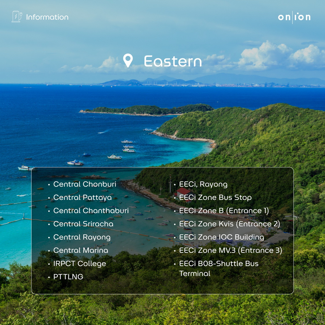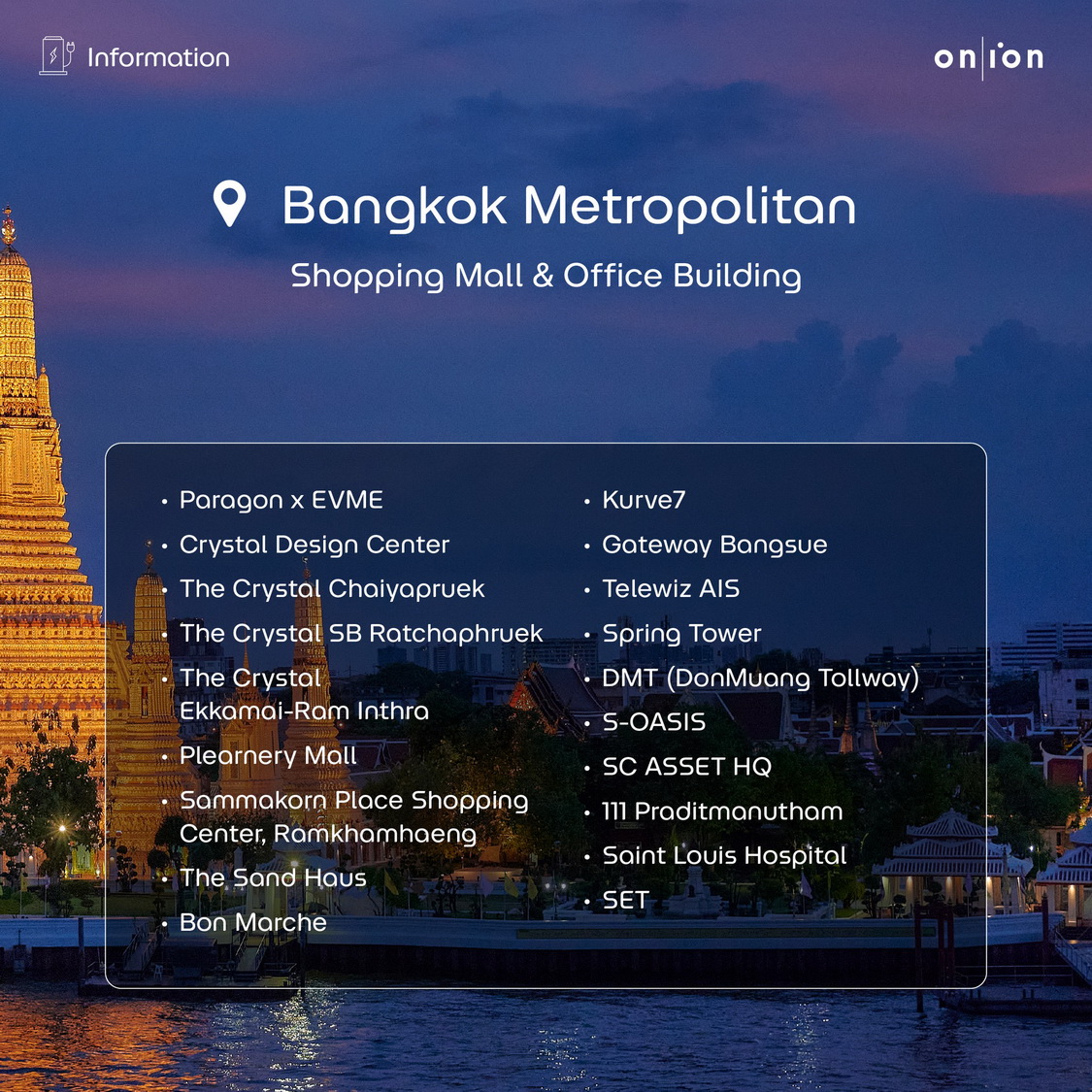 on-ion (ออน-ไอออน) ผู้ให้บริการสถานีอัดประจุสําหรับยานยนต์ไฟฟ้า (EV Charging Station) ภายใต้บริษัท อรุณ พลัส จํากัด ซึ่งดำเนินธุรกิจ EV Value Chain ของกลุ่ม ปตท. ขยายตัวอย่างต่อเนื่องเพื่อสนับสนุนให้คนไทยใช้พลังงานสะอาด เป็นมิตรต่อสิ่งแวดล้อม หัวชาร์จมีให้บริการทั้งแบบ AC และ DC เปิดให้บริการ 24 ชั่วโมง เช็กพิกัดสถานีได้โดยการโหลดแอปฯ 'Onion EV Charger' หรือสอบถามเพิ่มเติมได้ที่ Line: @onionev