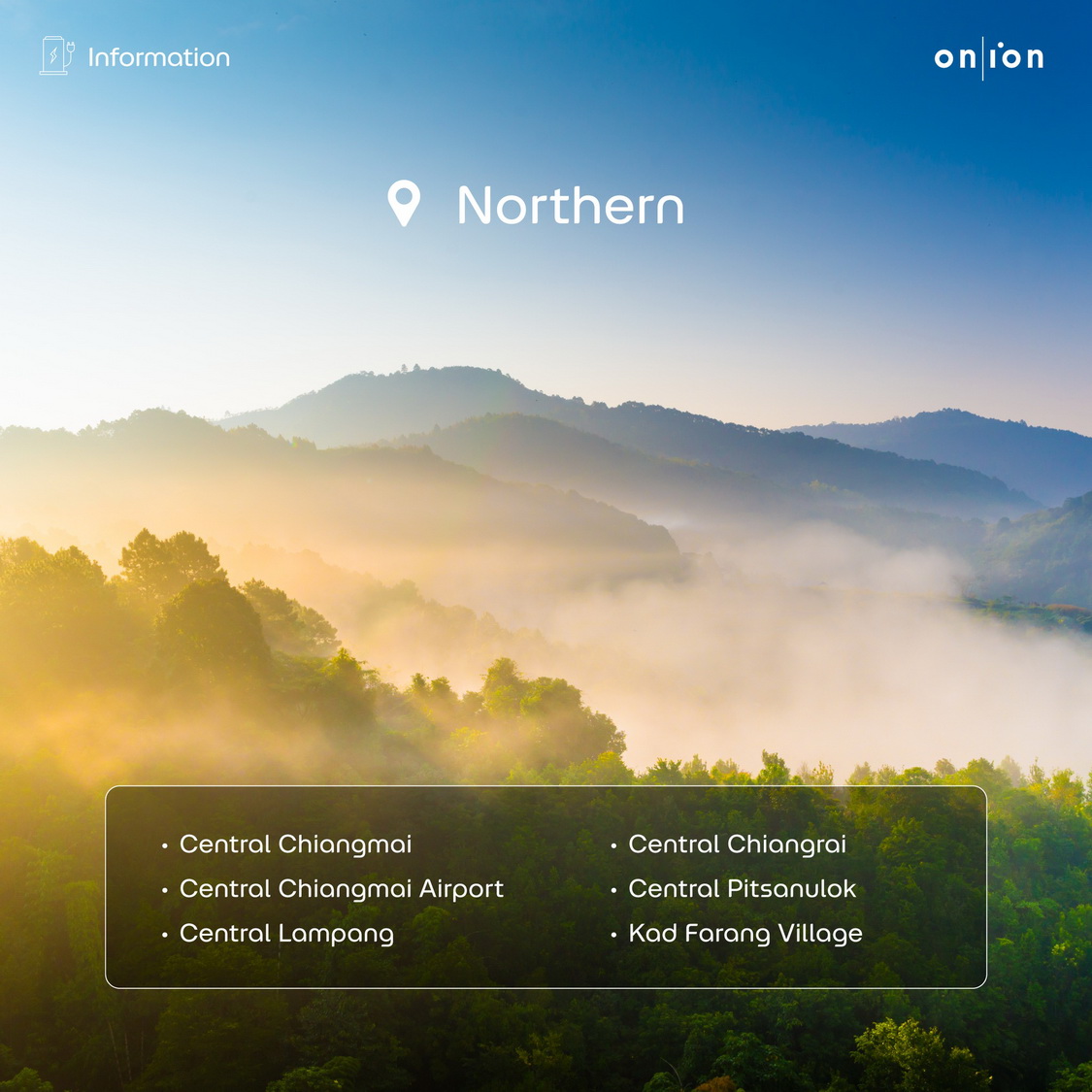 สถานีชาร์จ on-ion ที่ MAYA Lifestyle Shopping Center จ.เชียงใหม่ ติดตั้งเครื่องชาร์จ AC Charger (22 kW) จํานวน 4 ช่องจอด คิดค่าชาร์จ 8.50 บาท/kWh และเครื่องชาร์จแบบ DC Charger (25 kW) จํานวน 2 ช่องจอด ค่าชาร์จ 9.50 บาท/kWh เปิดให้บริการ ทุกวัน เวลา 10.00 น. - 05.00 น.