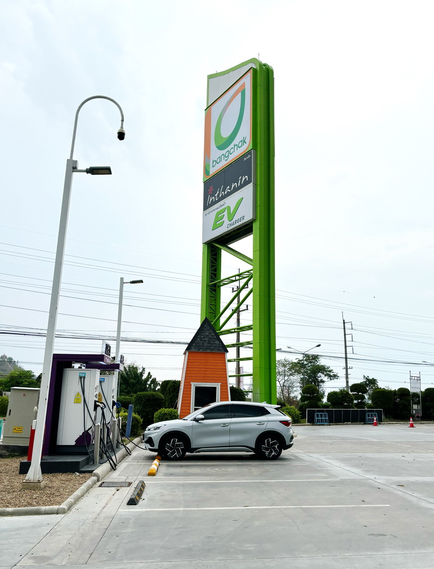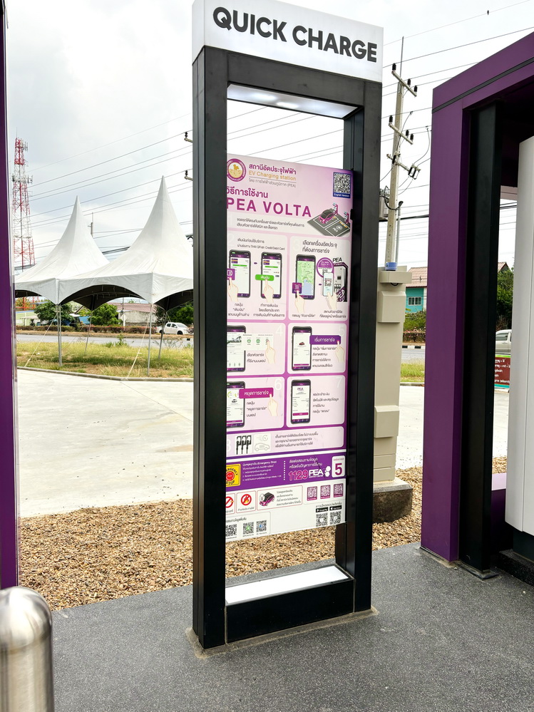 เป็นสถานีชาร์จของ PEA VOLTA ที่มีป้ายโดดเด่นสะดุดตาด้านขวามือทางเข้า ติดตั้งตัวตู้ชาร์จรุ่นใหม่ ขนาด 120 kW จำนวน 2 ตู้ แต่ละตู้มีหัวชาร์จที่หลากหลายให้เลือก 3 รูปแบบ ทั้งประเภท AC-Type 2 , DC-CCS Combo 2 และ DC-CHAdeMO