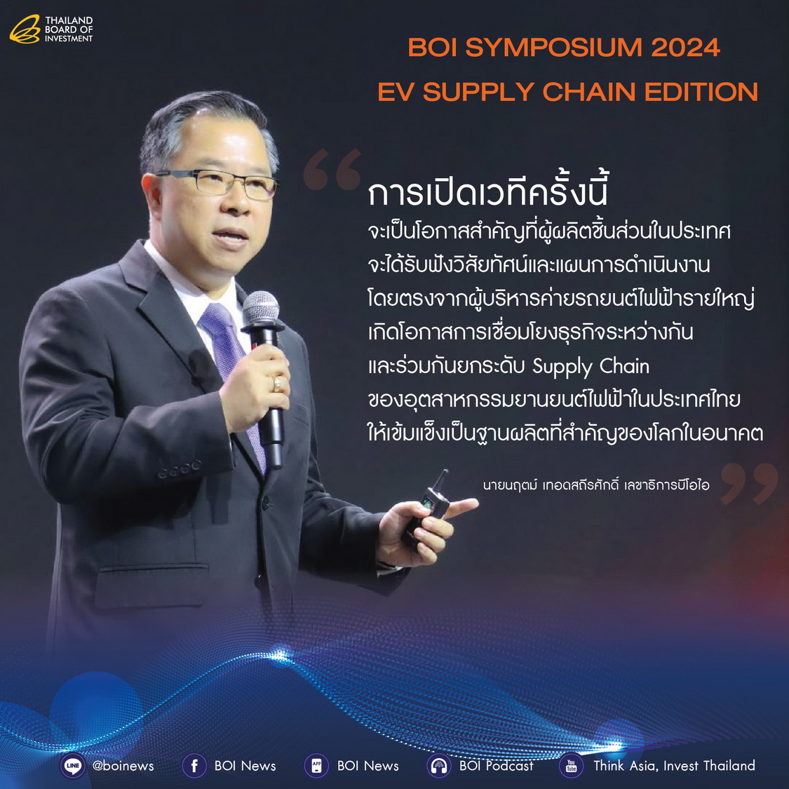 สำหรับเวที “BOI Symposium: EV Supply Chain” 7 ค่ายผู้ผลิตรถยนต์ชั้นนำของจีน ได้แก่ BYD , MG , Great Wall Motor , NETA , Changan , GAC Aion และ Omoda & Jaecoo ร่วมแสดงวิสัยทัศน์ และแผนการจัดซื้อจัดหาชิ้นส่วนในประเทศ โดยแต่ละรายตอกย้ำจุดยืนในการใช้ไทยเป็นฐานผลิตหลักในอาเซียน และมองโอกาสที่จะใช้ชิ้นส่วนในประเทศสูงสุดถึงร้อยละ 90 เพื่อให้ไทยเป็นฐานผลิตเพื่อส่งออกในอนาคต