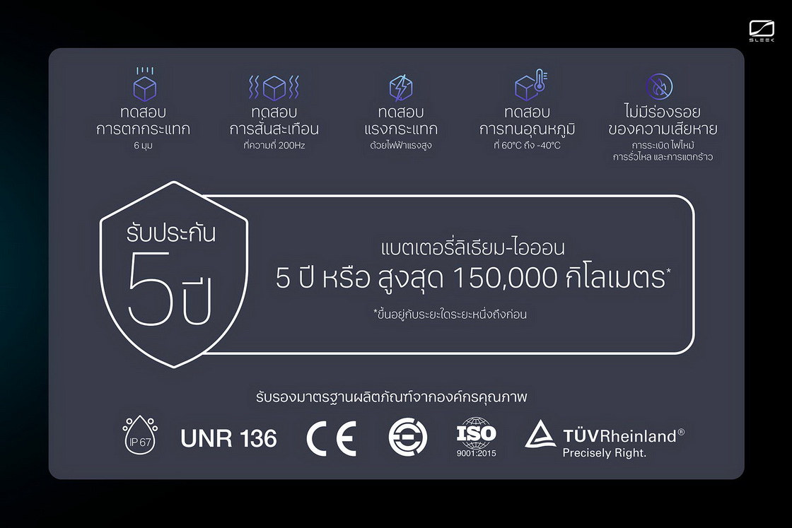 • มาตรฐาน UNR136 : ผ่านการทดสอบการตก การสั่นสะเทือน การกระแทก และอุณหภูมิสูงสุดถึง 60°C และต่ำสุดถึง -40°C อย่างปลอดภัย