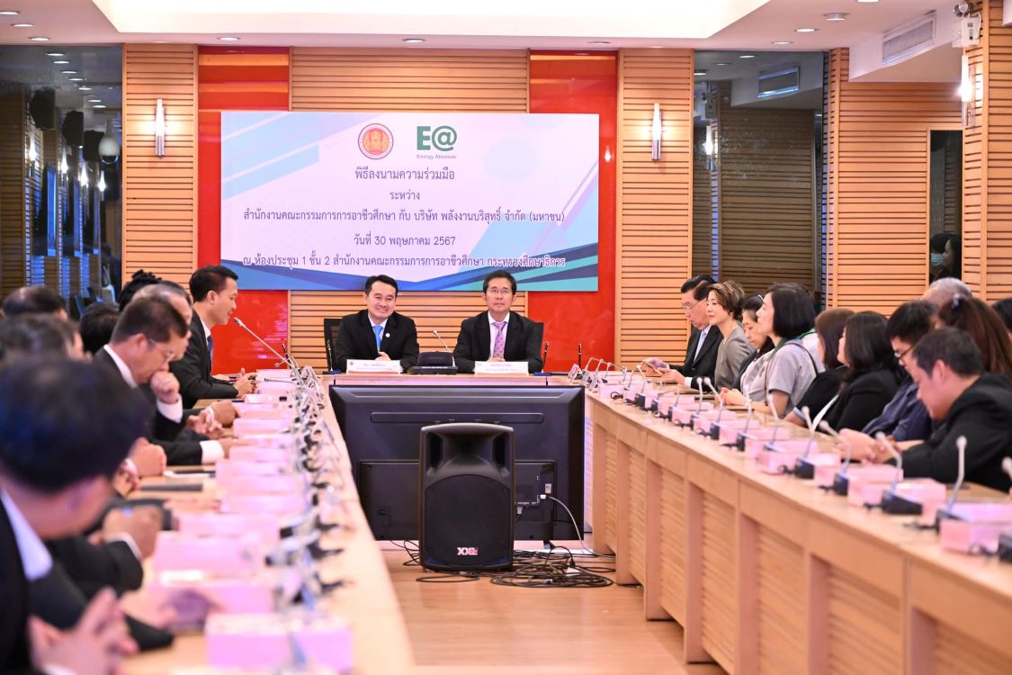 นายยศพล เวณุโกเศศ เลขาธิการคณะกรรมการการอาชีวศึกษา มอบหมายให้ นายสง่า แต่เชื้อสาย ผู้ช่วยเลขาธิการคณะกรรมการการอาชีวศึกษา ลงนามความร่วมมือ ระหว่าง สำนักงานคณะกรรมการการอาชีวศึกษา กับ บริษัท พลังงานบริสุทธิ์ จำกัด (มหาชน) โดยมีนายสมโภชน์ อาหุนัย ประธานเจ้าหน้าที่บริหาร บริษัท พลังงานบริสุทธิ์ จำกัด (มหาชน) ร่วมลงนาม พร้อมด้วยนายจำรัส สว่างสมุทร ผู้ช่วยประธานเจ้าหน้าที่บริหาร บริษัท พลังงานบริสุทธิ์ จำกัด (มหาชน) ผู้บริหารสถานศึกษา เจ้าหน้าที่ผู้เกี่ยวข้อง ร่วมพิธี ณ ห้องประชุม 1 สำนักงานคณะกรรมการการอาชีวศึกษา เมื่อวันที่ 30 พฤษภาคม 2567