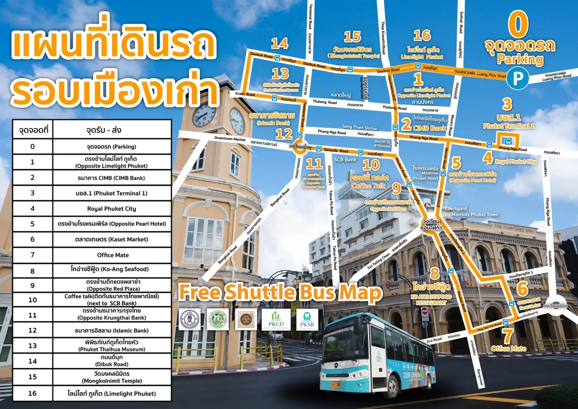 จุดที่ 1 ลานมังกร จุดที่ 2 แยกเมืองเก่าชาร์เตอร์ จุดที่ 3 ธนาคารออมสิน จุดที่ 4 จอดฝั่งโรงแรมรอยัลภูเก็ตซิตี้ จุดที่ 5 ตรงข้ามกับ โรงแรมเพิร์ล จุดที่ 6 Mc Donald's จุดที่ 7 วงเวียนสุรินทร์ จุดที่ 8 จุดจอดรถเทศบาลแดงพลาซ่า จุดที่ 9 จอดธนาคารกรุงศรี จุดที่ 10 จอดฝั่ง ธนาคารอิสลาม จุดที่ 11 หน้าพิพิธภัณฑ์ภูเก็ตไทยหัว จุดที่ 14 ถนนดีบุก จุดที่ 15 จอดฝั่ง วัดมงคลนิมิตร และจุดที่ 16 ไลม์ไลท์ ภูเก็ต