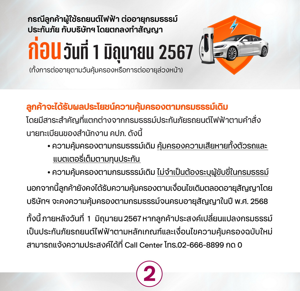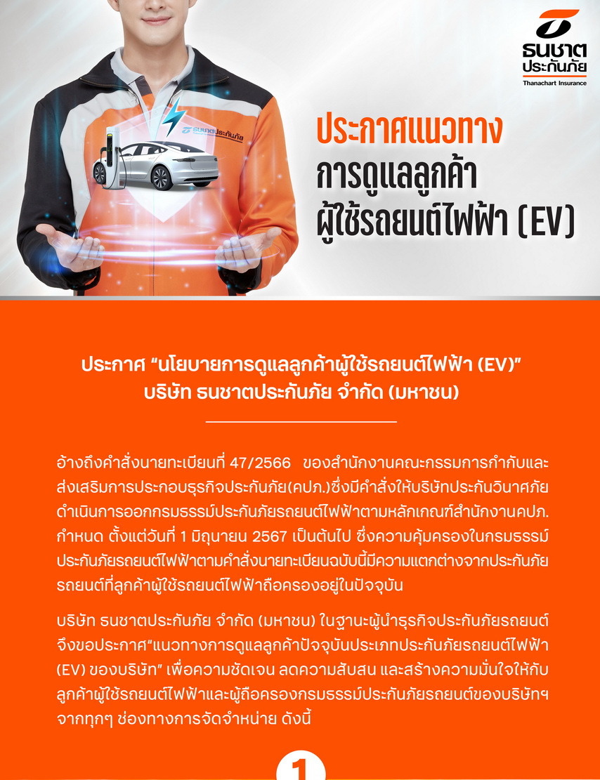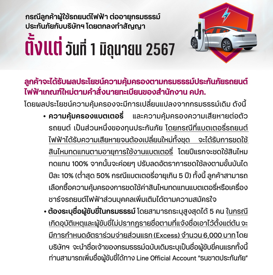 ธนชาตประกันภัย ประกาศ “นโยบายการดูแลลูกค้าผู้ใช้รถยนต์ไฟฟ้า (EV)” ปีแรกถ้าแบตเตอรี่เสียหายจนต้องเปลี่ยนใหม่ทั้งชุดจ่าย 100% มีการกำหนดค่าเสื่อมแบตเตอรี่ ปรับลดเป็นขั้นบันไดปีละ 10% ปีที่ 5 ลดเหลือ 50% และต้องระบุชื่อผู้ขับขี่สูงสุด 5 คน