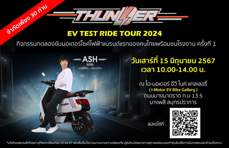 ไอ-มอเตอร์ จัดกิจกรรมทดสอบสมรรถนะรถมอเตอร์ไซค์ไฟฟ้า รุ่น THUNDER , THUNDER Croz และ Vapor , Vapor CBS พร้อมเยี่ยมชมโรงงานผลิตรถมอเตอร์ไซค์ไฟฟ้าแบรนด์แรกของคนไทยที่ได้รับการรับรองจากสภาอุตสาหกรรมแห่งประเทศไทยให้ใช้โลโก้ “Made in Thailand” เป็นรายแรกและรายเดียวของไทย ในวันที่ 15 มิถุนายน 2567 เวลา 10.00-14.00 น. ที่ ไอ-มอเตอร์ อีวี ไบค์ แกลเลอรี่ บางพลี สมุทรปราการ
