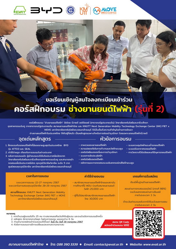 BYD ร่วมกับ สมาคมยานยนต์ไฟฟ้าไทย และมหาวิทยาลัยเทคโนโลยีพระจอมเกล้าธนบุรี เปิดคอร์สฝึกอบรม ช่างยานยนต์ไฟฟ้า ครั้งที่ 2 ปิดรับสมัคร 19 ก.ค. 2567