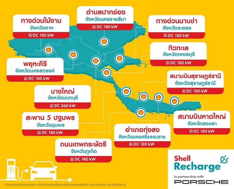 บริษัท เชลล์แห่งประเทศไทย จำกัด โดยกลุ่มธุรกิจโมบิลลิตี้ ผู้ให้บริการสถานีบริการ น้ำมันเชื้อเพลิงคุณภาพสูง เดินหน้าทำตามพันธสัญญาร่วมกับปอร์เช่ เอชีย แปซิฟิก เปิดสถานีชาร์จพลังงานไฟฟ้าสมรรถนะสูง (High Performance Charging: HPC) ขนาด 180 กิโลวัตต์ ภายใต้แบรนด์ Shell Recharge ในสถานีบริการน้ำมันเชลล์ สถานีแรกที่เปิดให้บริการ คือ สถานีบริการเชลล์ บางใหญ่ จังหวัดนนทบุรี เมื่อปลายปี 2565 แห่งที่สองเปิดที่สถานีบริการเชลล์ ทิวทะเล เวิล์ด อำเภอชะอำ จังหวัดเพชรบุรี ปัจจุบันขยายไปแล้วมากกว่า 13 สถานี ขณะรอชาร์จสามารถใช้บริการร้านสะดวกซื้อ Shell SELECT รวมถึงร้านกาแฟและขนม Shell Café หรือ delicafé ได้