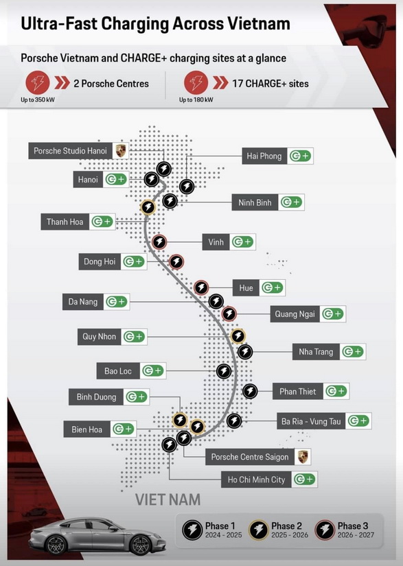 สถานีชาร์จ 9 แห่งแรกจะพร้อมใช้งานภายในครึ่งแรกของปี 2568 ในเมืองสำคัญๆ เช่น ฮานอย โฮจิมินห์ซิตี้ ไฮฟอง และดานัง และอีก 8 แห่งที่เหลือจะเปิดในปี 2570 สถานีชาร์จประสิทธิภาพสูงสองแห่งที่ปอร์เช่ Studio Hanoi และ Porsche Center Saigon จะถูกรวมเข้ากับแอป Charge+