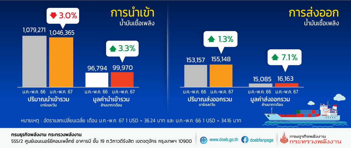 การนำเข้าน้ำมันเชื้อเพลิง เดือนมกราคม – พฤษภาคม 2567 เฉลี่ยอยู่ที่ 1,046,365 บาร์เรล/วัน ลดลงจากช่วงเดียวกันของปีก่อนร้อยละ 3.0 คิดเป็นมูลค่าการนำเข้ารวม 99,970 ล้านบาท/เดือน โดยเป็นการนำเข้าน้ำมันดิบ อยู่ที่ 986,155 บาร์เรล/วัน ลดลงร้อยละ 1.7 คิดเป็นมูลค่าการนำเข้าน้ำมันดิบอยู่ที่ 95,166 ล้านบาท/เดือน สำหรับการนำเข้าน้ำมันสำเร็จรูป (น้ำมันเบนซินพื้นฐาน น้ำมันดีเซลพื้นฐาน น้ำมันเตา น้ำมันอากาศยาน และ LPG) อยู่ที่ 60,210 บาร์เรล/วัน ลดลงร้อยละ 21.0 คิดเป็นมูลค่าการนำเข้าน้ำมันสำเร็จรูปอยู่ที่ 4,804 ล้านบาท/เดือน