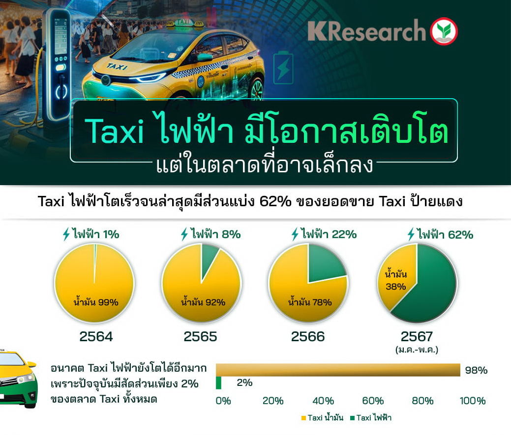 ศูนย์วิจัยกสิกรไทยชี้ให้เห็นว่า รถแท็กซี่ไฟฟ้า (EV) กำลังเข้ามาเปลี่ยนโฉมหน้าตลาดรถแท็กซี่ในประเทศไทยอย่างมีนัยสำคัญ จากปี 2564 ที่มีสัดส่วนเพียง 1% เท่านั้น ตัวเลขนี้สะท้อนให้เห็นถึงความนิยมที่เพิ่มขึ้นอย่างรวดเร็วของรถแท็กซี่ไฟฟ้าในหมู่ผู้ประกอบการและผู้ขับขี่รถแท็กซี่